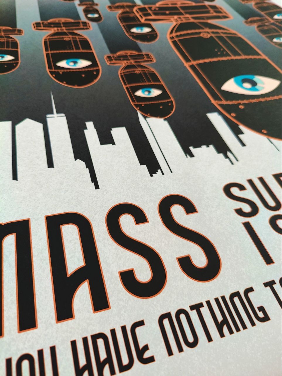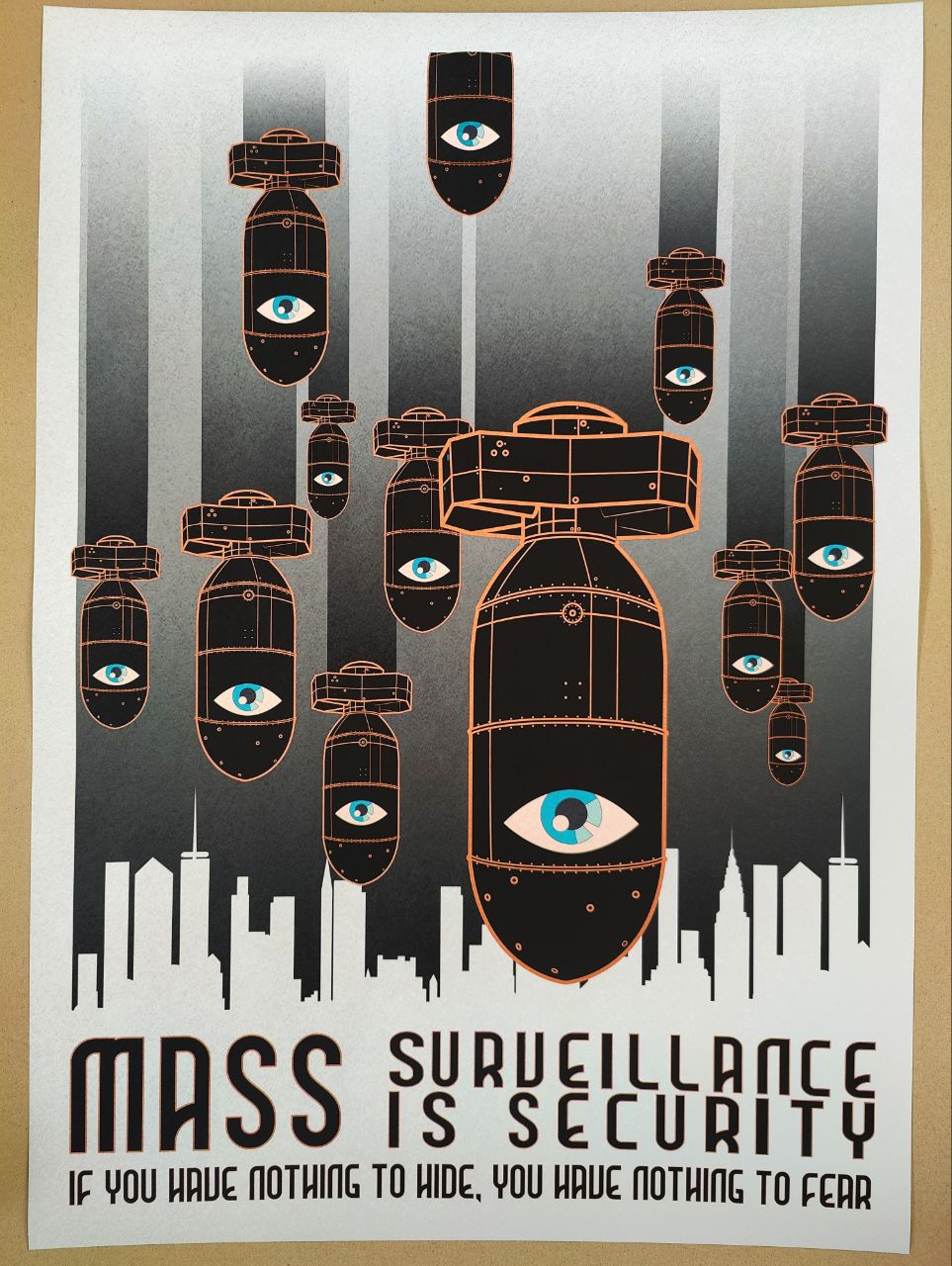 The print challenges viewers to critically evaluate the ways in which propaganda can be used to justify acts of violence and mass surveillance. It encourages reflection on the potential consequences of unchecked power and the importance of protecting individual rights and freedoms.