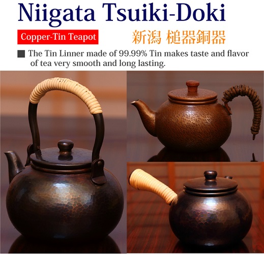 Tsuiki-doki copperware refers to it being hammered and is a specialty product of Tsubame, a city in Niigata. Utilizing their sophisticated skills - skills that have been passed down from generation to generation since the Edo era, professional craftsmen use dozens of iron shaping rods and hammers to whip the copper into the desired shape before laminating it with tin. The resulting tea kettles not only put people in the mood for tea appreciation with their elegant and intricate designs, but also make sure that the tea you brew is smooth and layered.