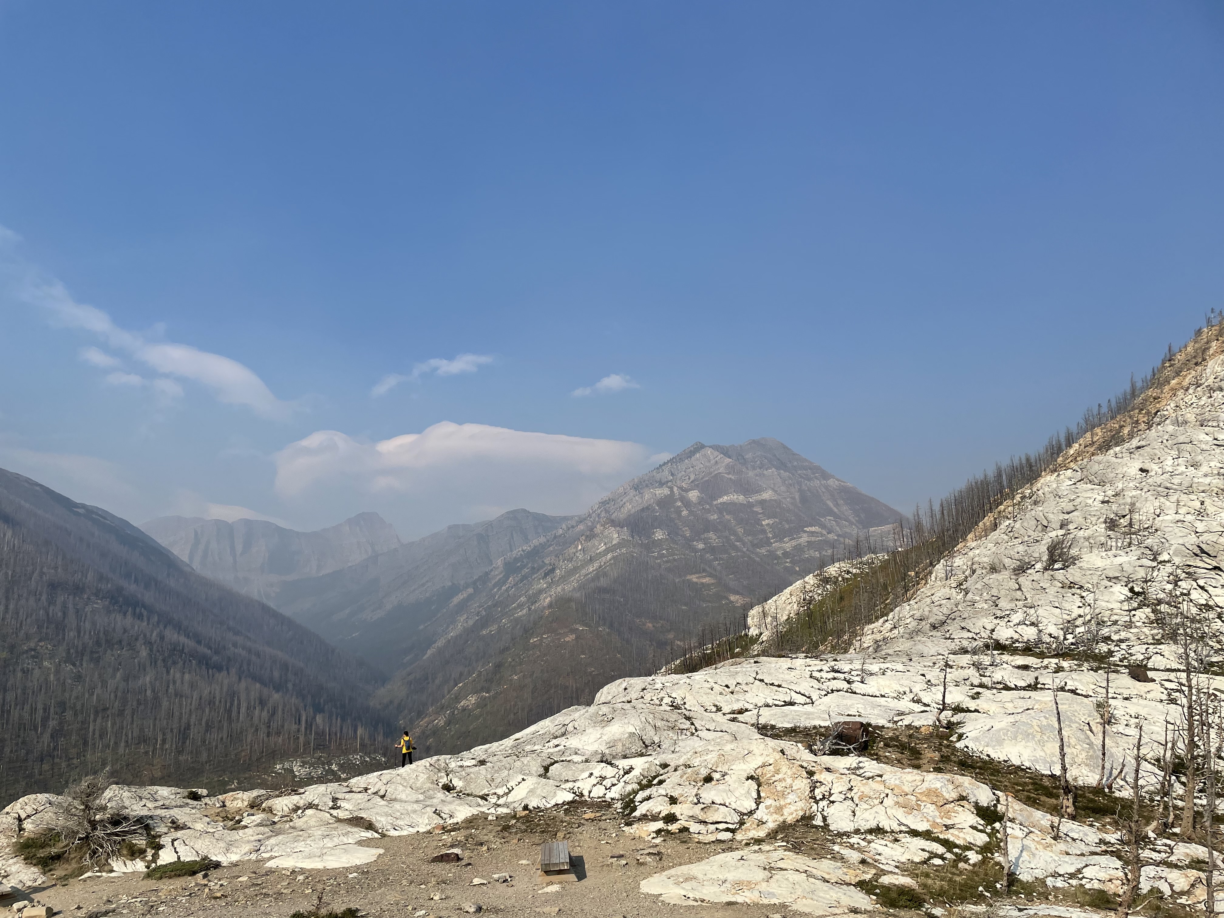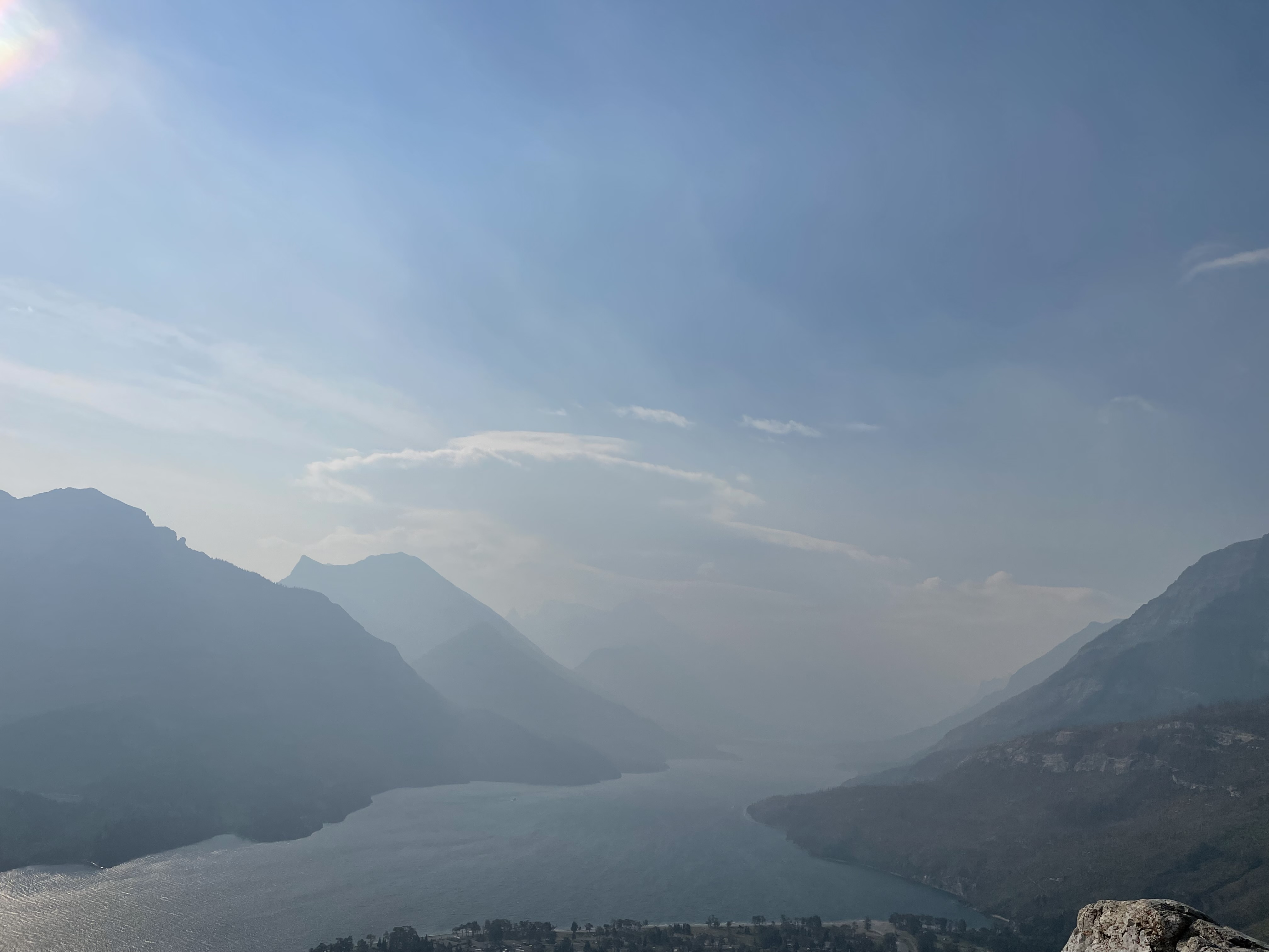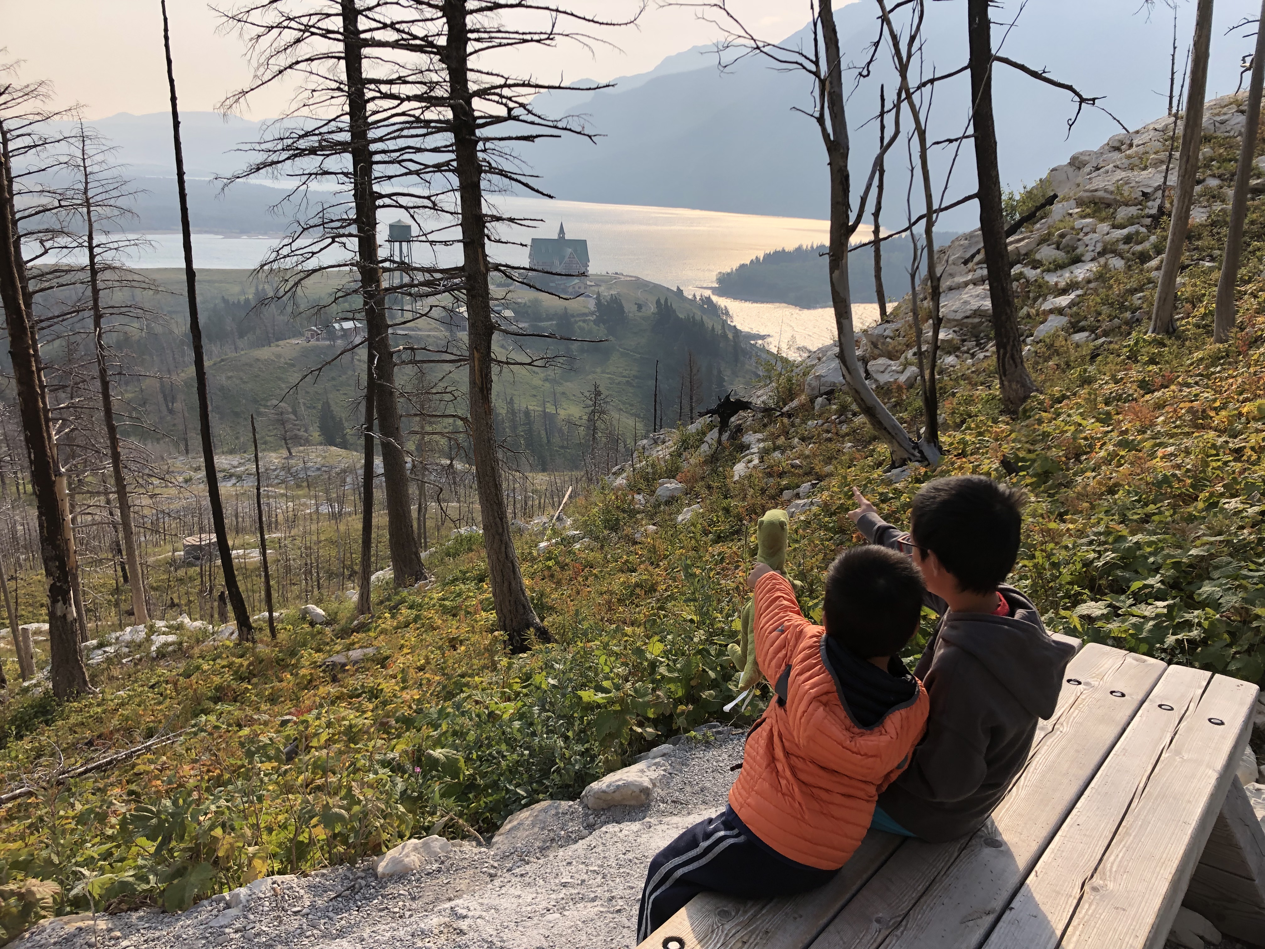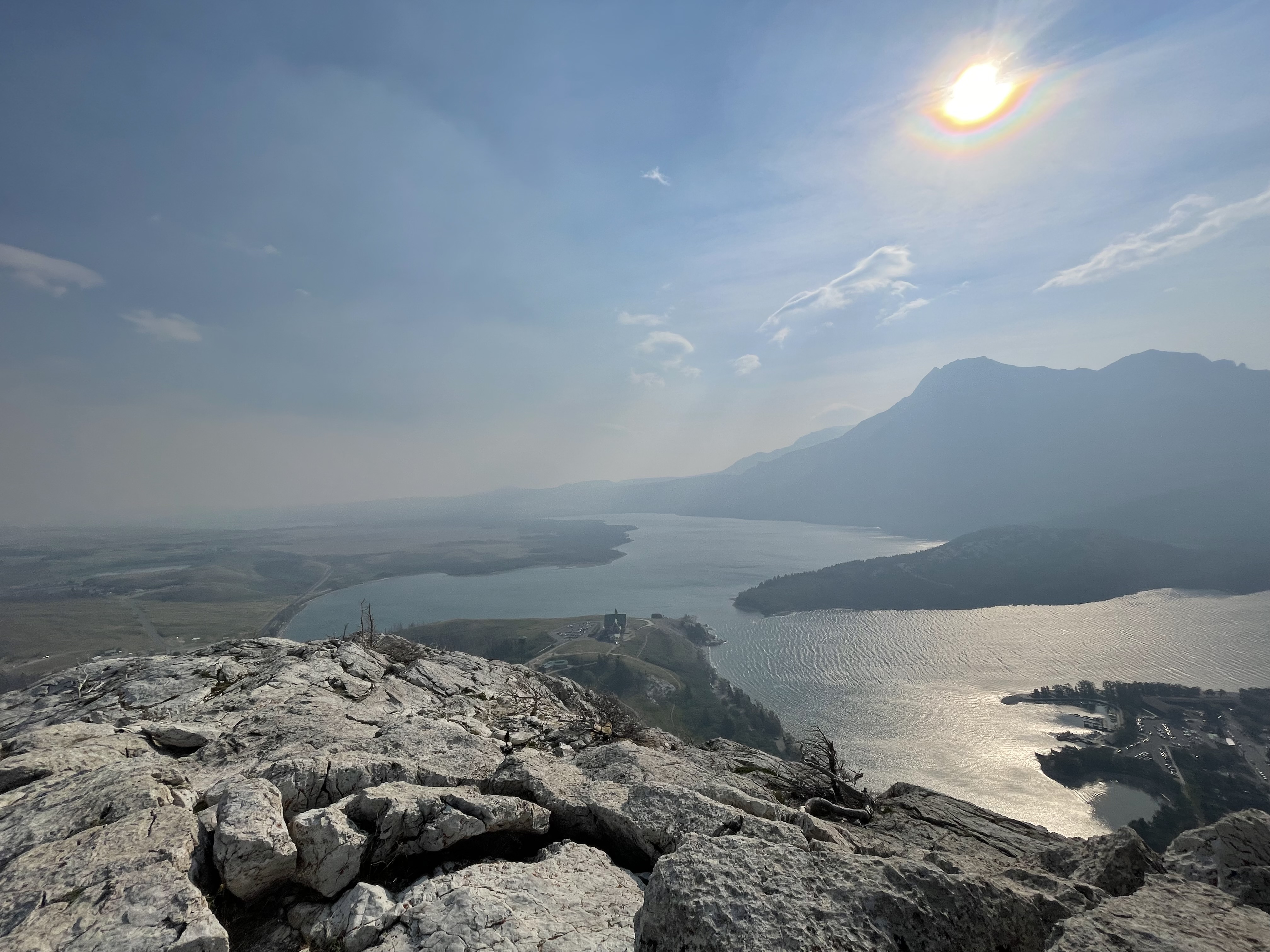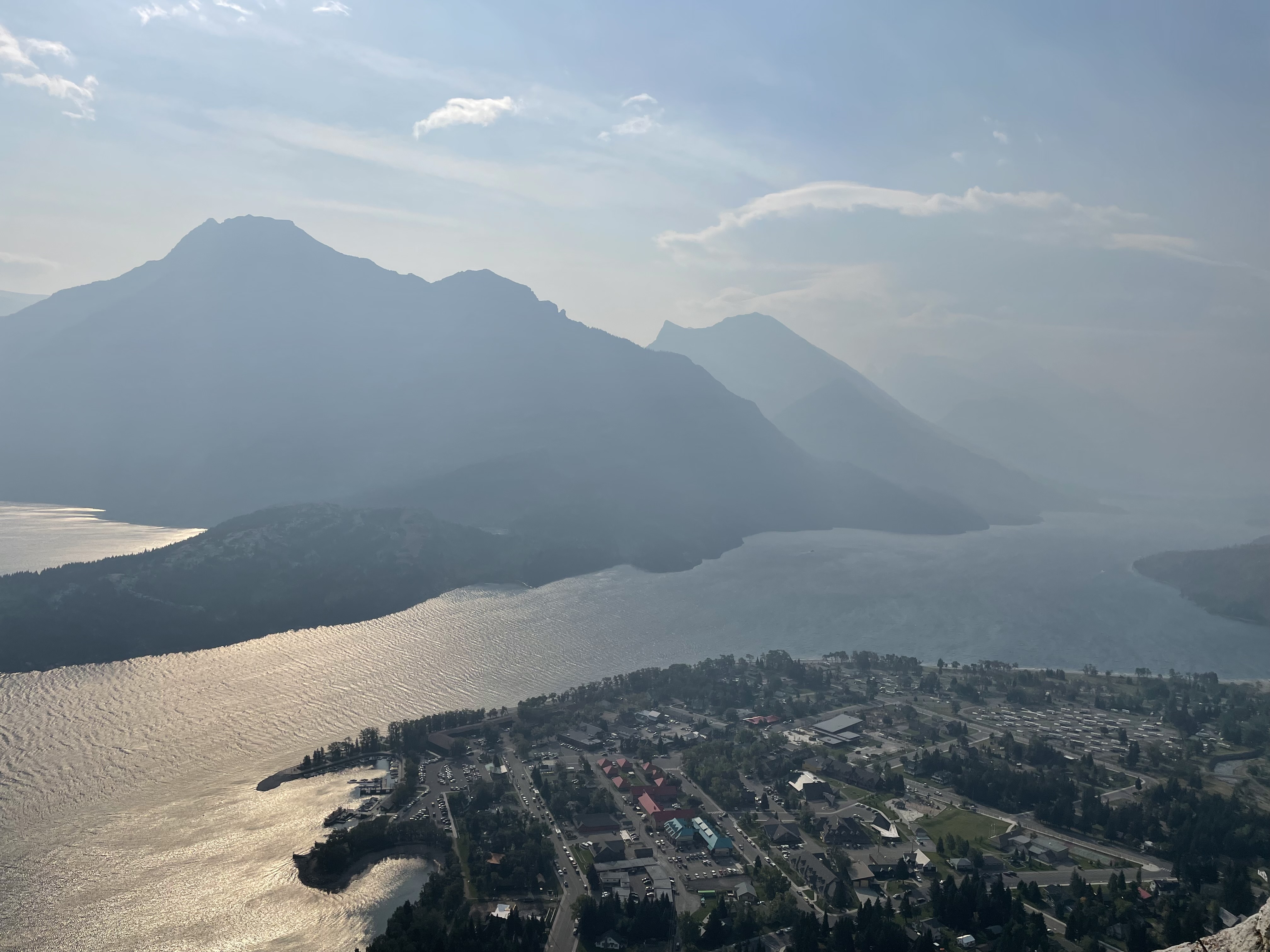 There were some forest fires nearby on the day we did our hike, so our view was slightly obstructed by a layer of smog and haze. The viewpoint at the top is a rocky bluff that boasts the views of the nearby town in the national park, surrounding lakes, and even distant lakes and mountains in the United States, as Glacier National Park of Montana is directly south of Waterton Lakes National Park. But we were unable to see too far into the distance when we got to the viewpoint. However, the views were still beautiful even with the smog.
