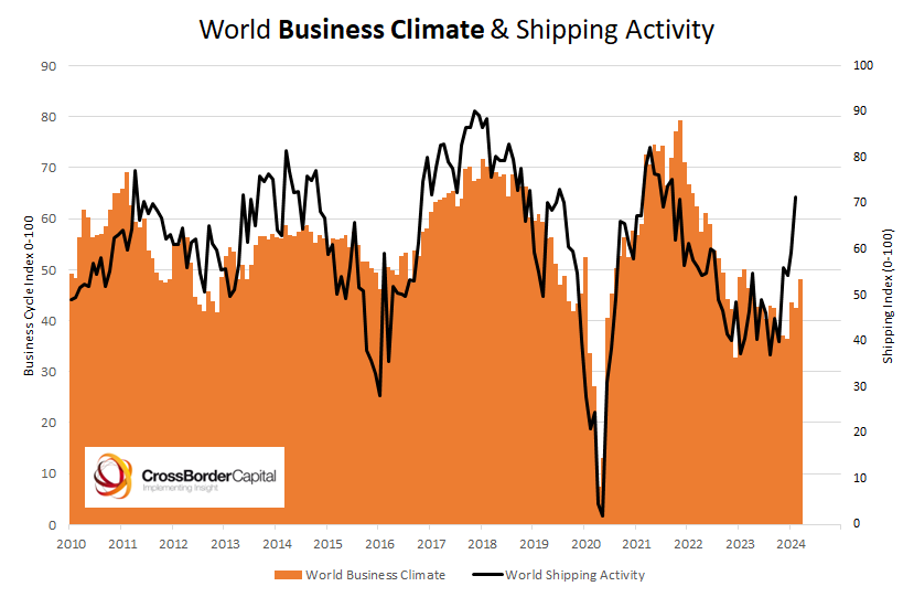 Recent data reveals a significant upturn in global business activity, indicating a bottoming out from the previous year. Shipping rates, a key indicator of global trade, are surging, propelled by Chinese stimulus measures and prolonged liquidity injections by central banks. Surprisingly, even amidst escalating tensions such as the Ukraine conflict and the Israel-Gaza crisis, stock markets remain resilient, experiencing boosts rather than implosions.