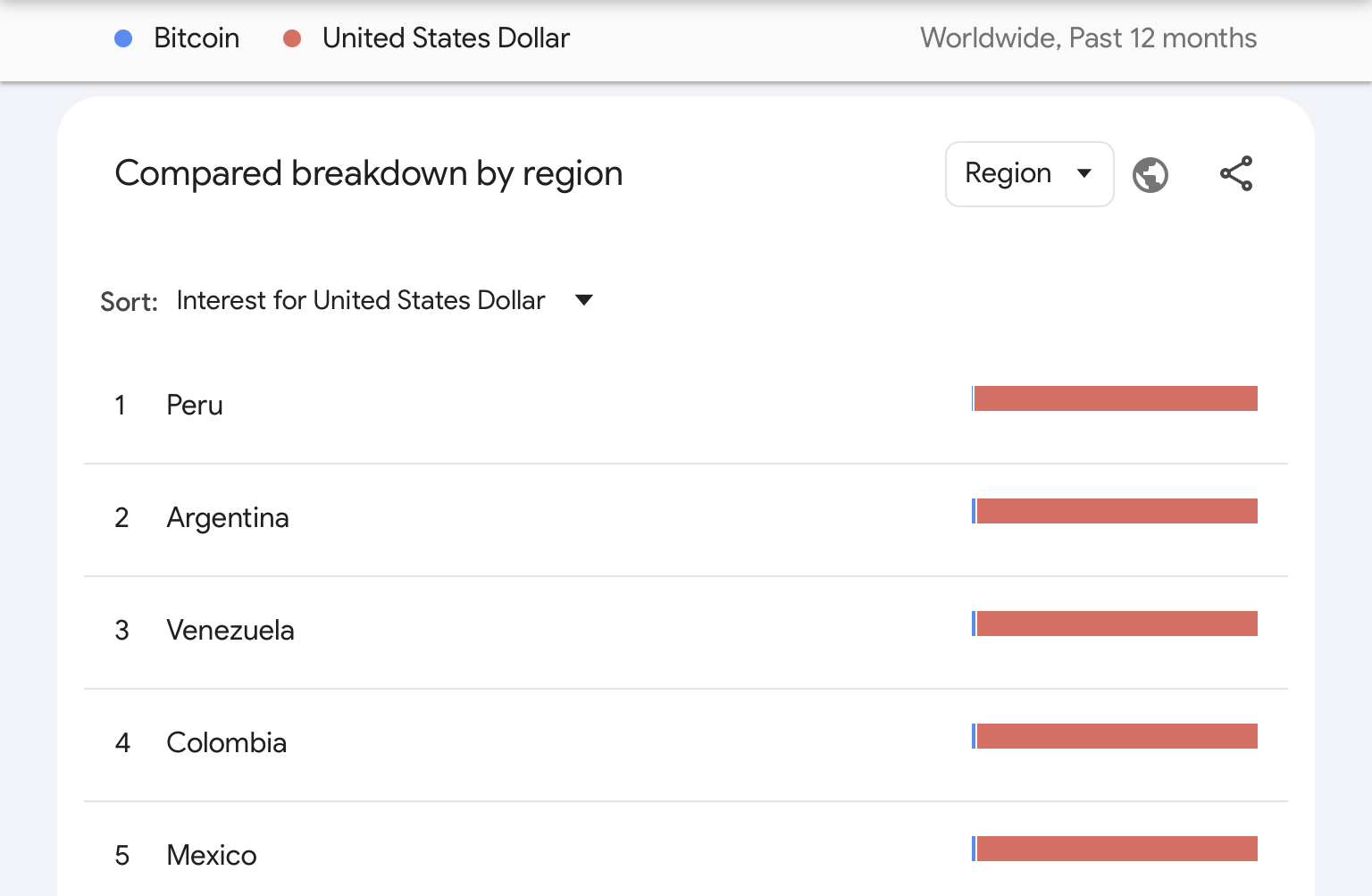 Searching for USD dominates pretty much everywhere. I am surprised that the dominance in the states like Argentina is so overwhelming. Or is it just me being surprised?