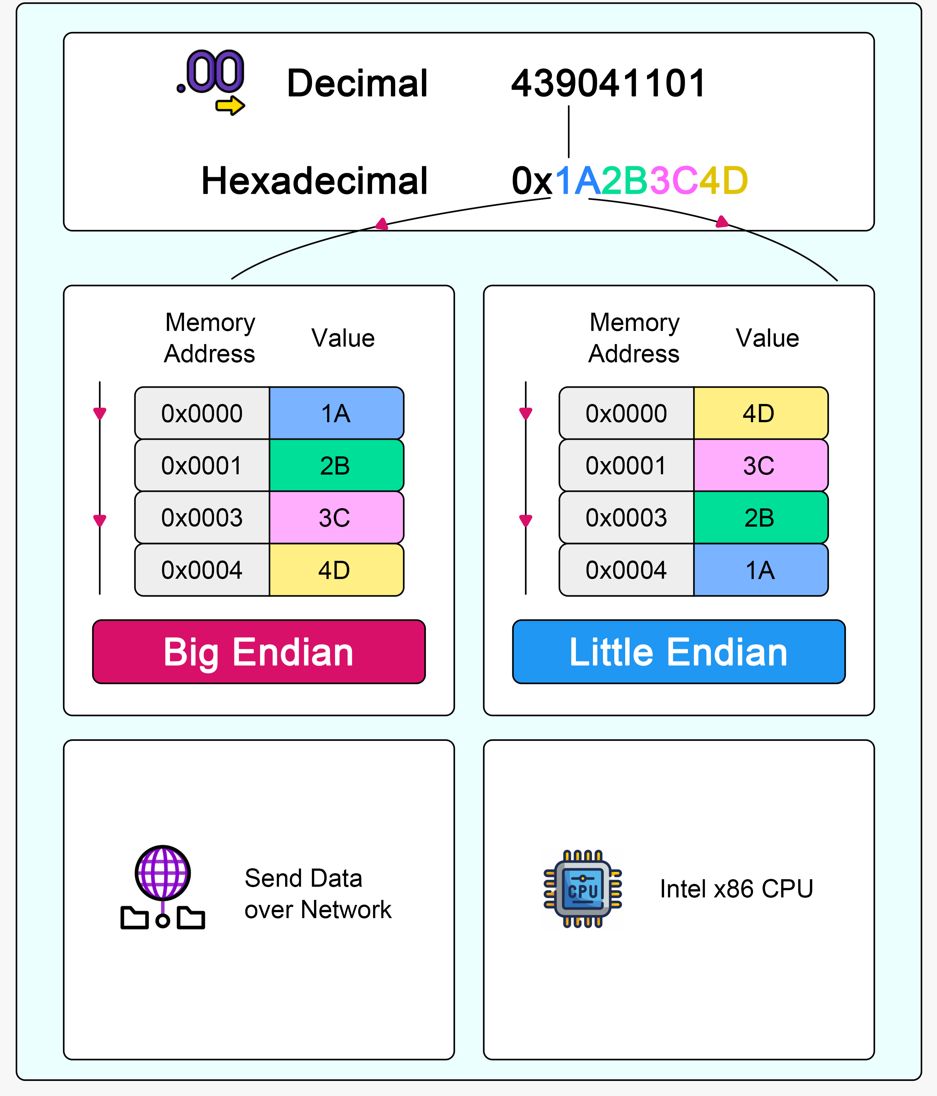 Microprocessor architectures commonly use two different methods to store individual bytes in memory. This difference is referred to as “byte ordering” or “endianness”.