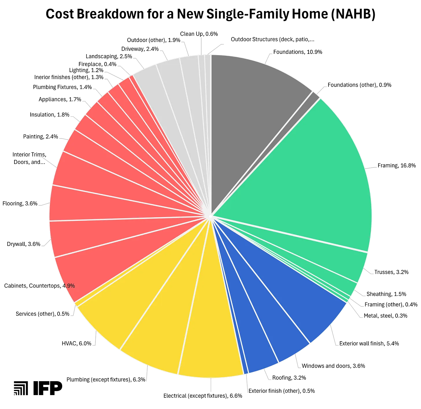 Because of the enormous costs of housing, it's worth understanding where, specifically, those costs come from, and what sort of interventions would be needed to reduce these costs. Discussions of housing policy often focus on issues of zoning, regulation, and other supply restrictions which manifest as increased land prices, but for most American housing, the largest cost comes from building the physical structure itself. However, in dense urban areas — the places where building new housing is arguably most important — this changes, and high land prices driven by regulatory restrictions become the dominant factor.