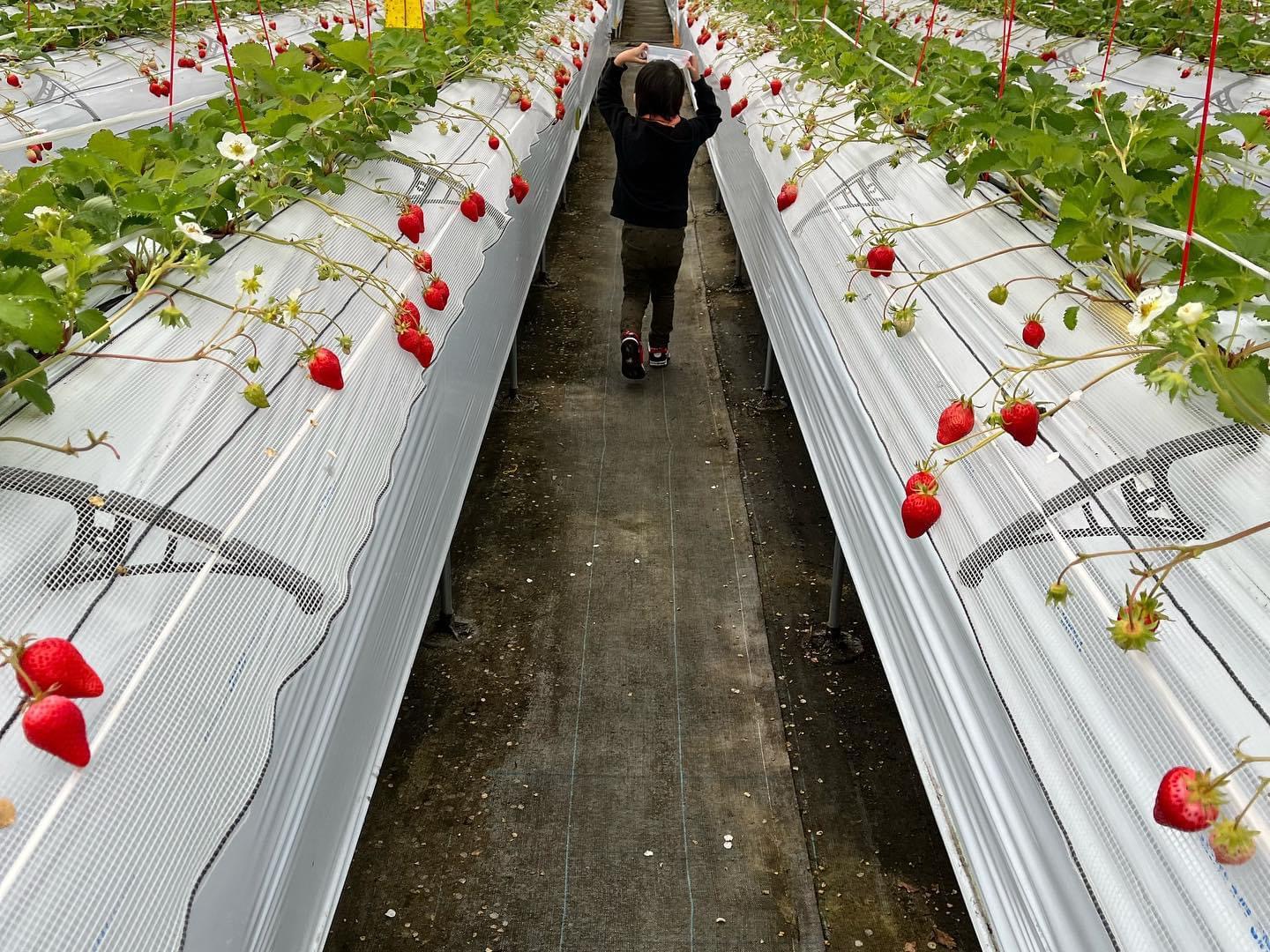 Racing to get strawberries at a strawberry farm