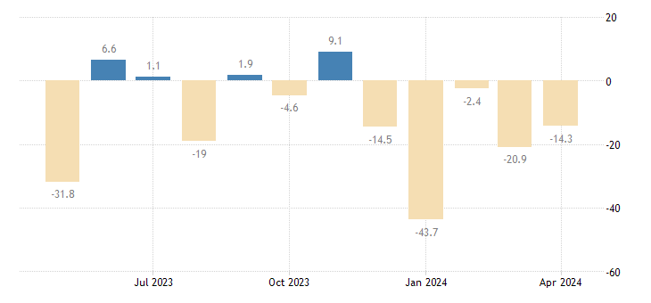 April 2024 sees NY Empire State Manufacturing Index inch up to -14.3 from previous -20.9, missing the mark at -9.0. Business activity remains in decline for fifth straight month, with drops in orders, shipments, and job market woes. Input costs rise slightly, while firms hold steady on selling prices. Despite dim outlook, hope for improvement in coming months.