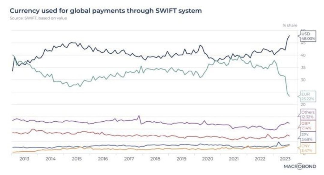 Anyone following the movements on the currency markets these days will notice that the US dollar is gaining massively and strength. The biggest problem child remains the eurozone, which is massively losing international significance in terms of Swift volume. The ECB will have to decide whether to defend interest rate spreads and sovereign debt or whether to continue to support its favorite child, the euro.