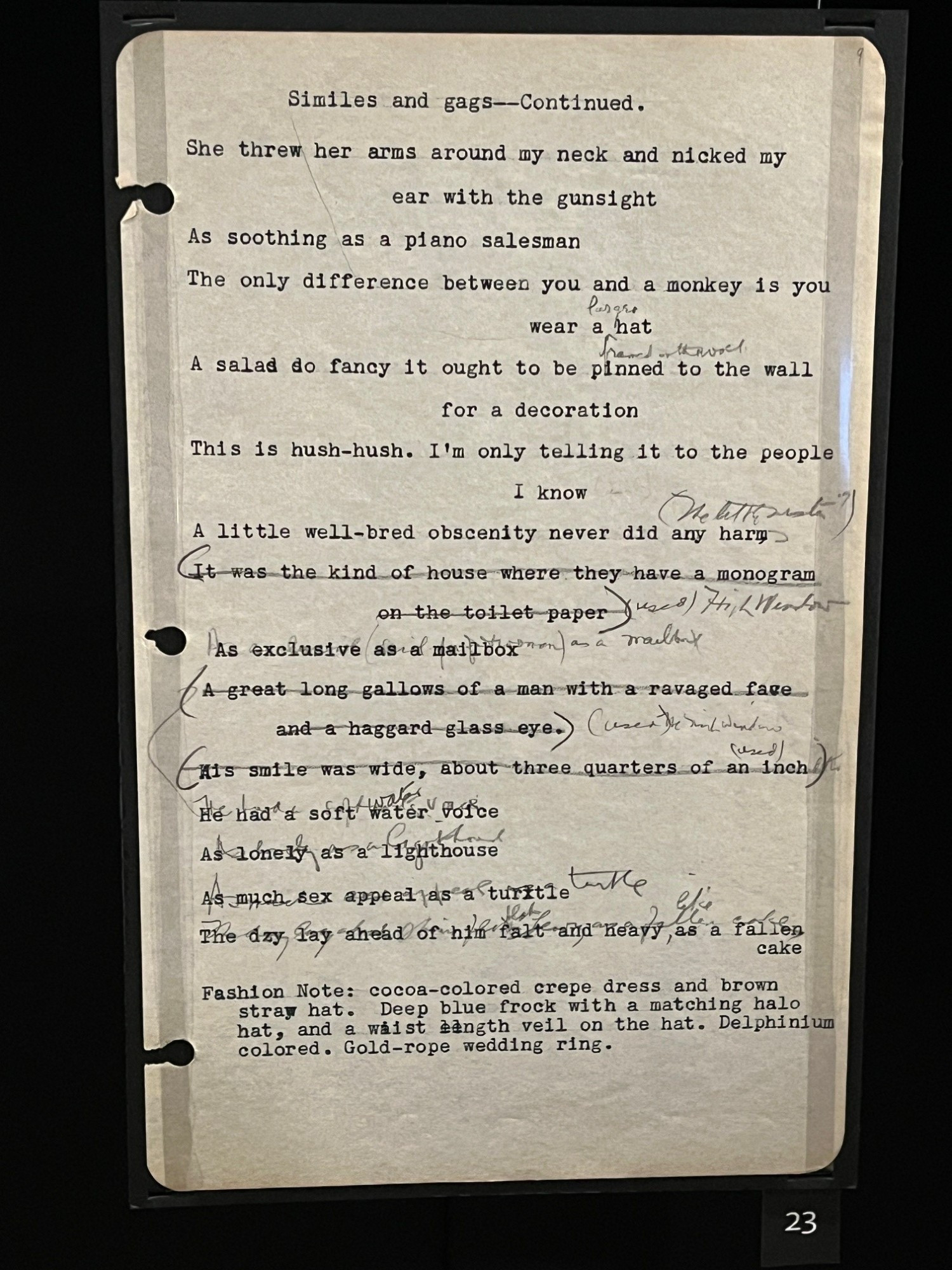 Raymond Chandler, one of the great crime novelists, kept separate sheets of similes and analogies he'd thought of so he could throw them into his works. He'd cross them off once he'd used them. Nowadays, writers can keep these things electronically, which means not getting to see the historical documents.