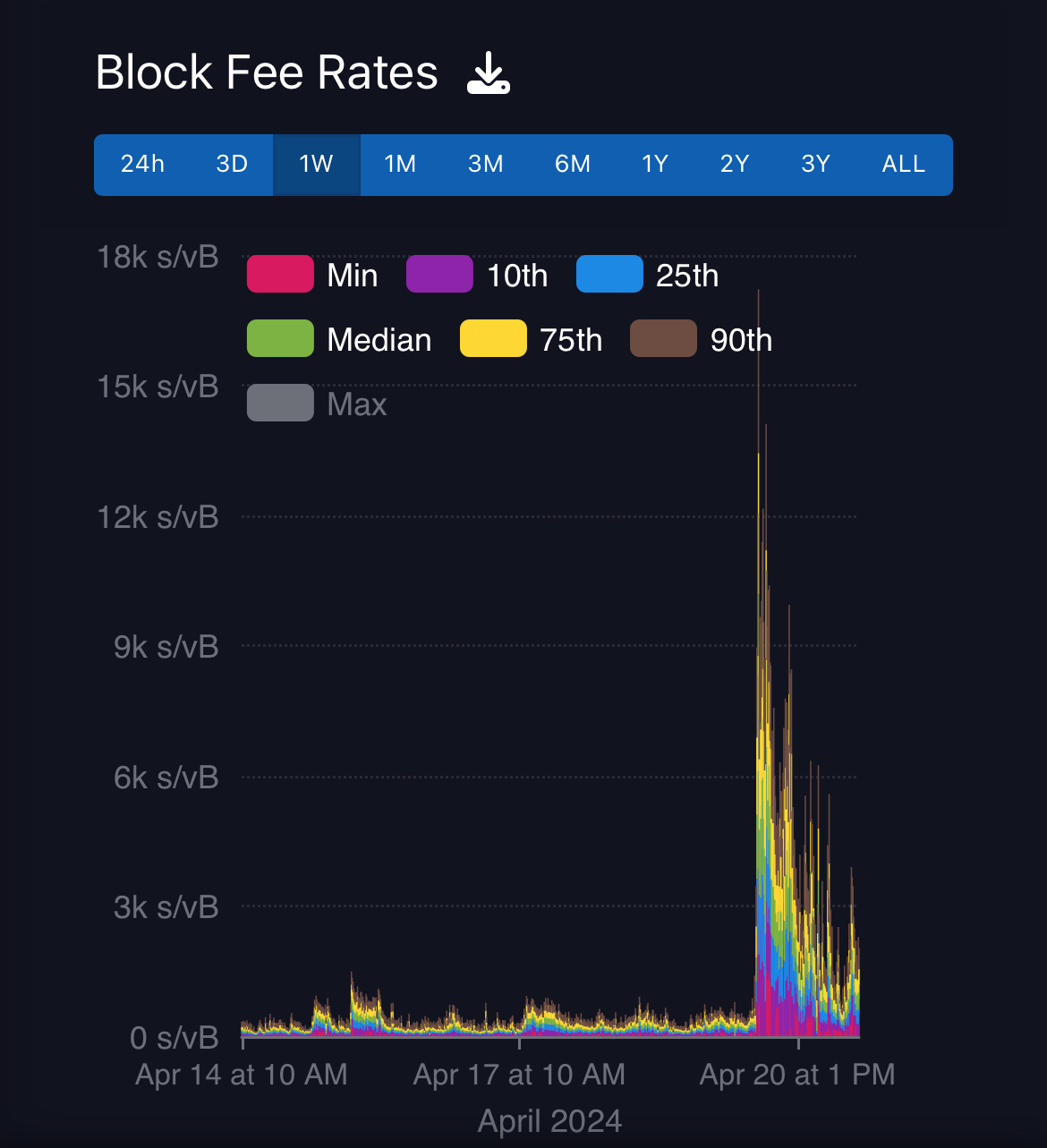 It wasn't just block 840,000 that had high fees, over the next 5 blocks, we had fees of 4.486, 6.99, 16.068, 24.008 and 29.821 BTC respectively. The fees are the highest it's ever been. This situation in Bitcoin is unprecedented.