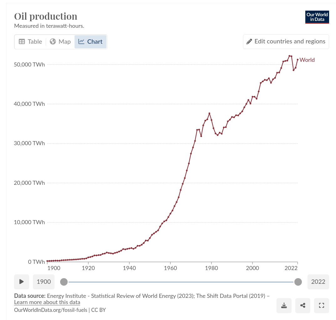 I wonder as well. Until 1979 oil production grows exponentially, then it stops growing and retrace until around 1982-85. From 1982-85 it grows more or less linearly. We can see, it seems, the Irak, Afghanistan and Libya wars, and the corona virus policies impact on oil production as well. What are the interesting things you see?