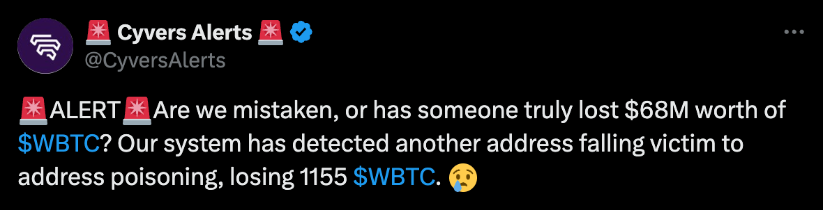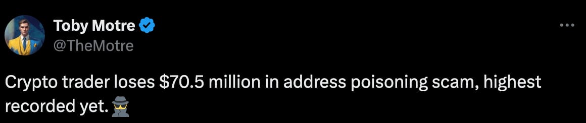 A crypto investor has been hit hard by a scam known as “address poisoning”.