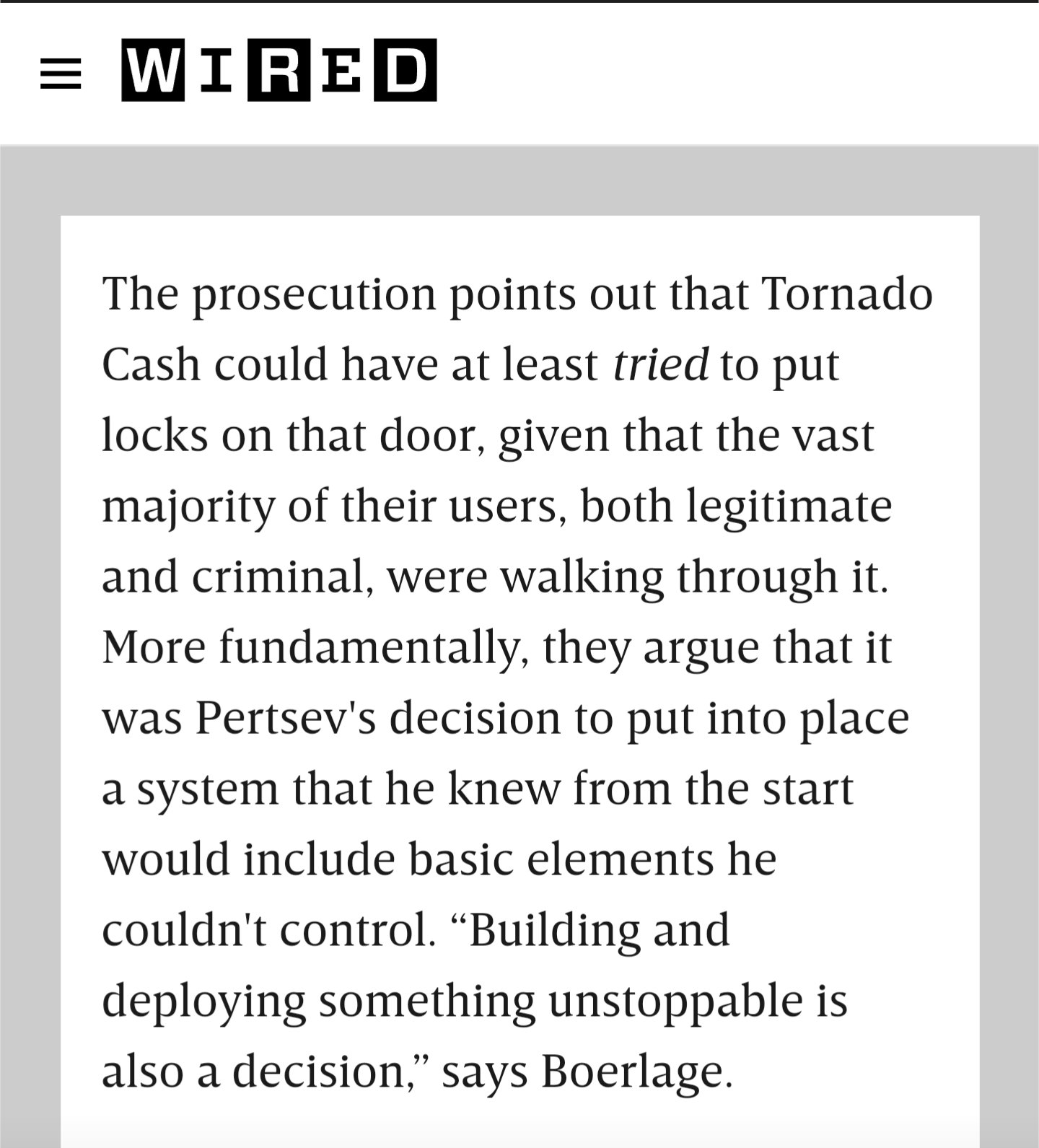 The position taken by prosecutors is that the act of deploying open source code can be criminal if criminals subsequently use that code - regardless of the original developers' lack of control.