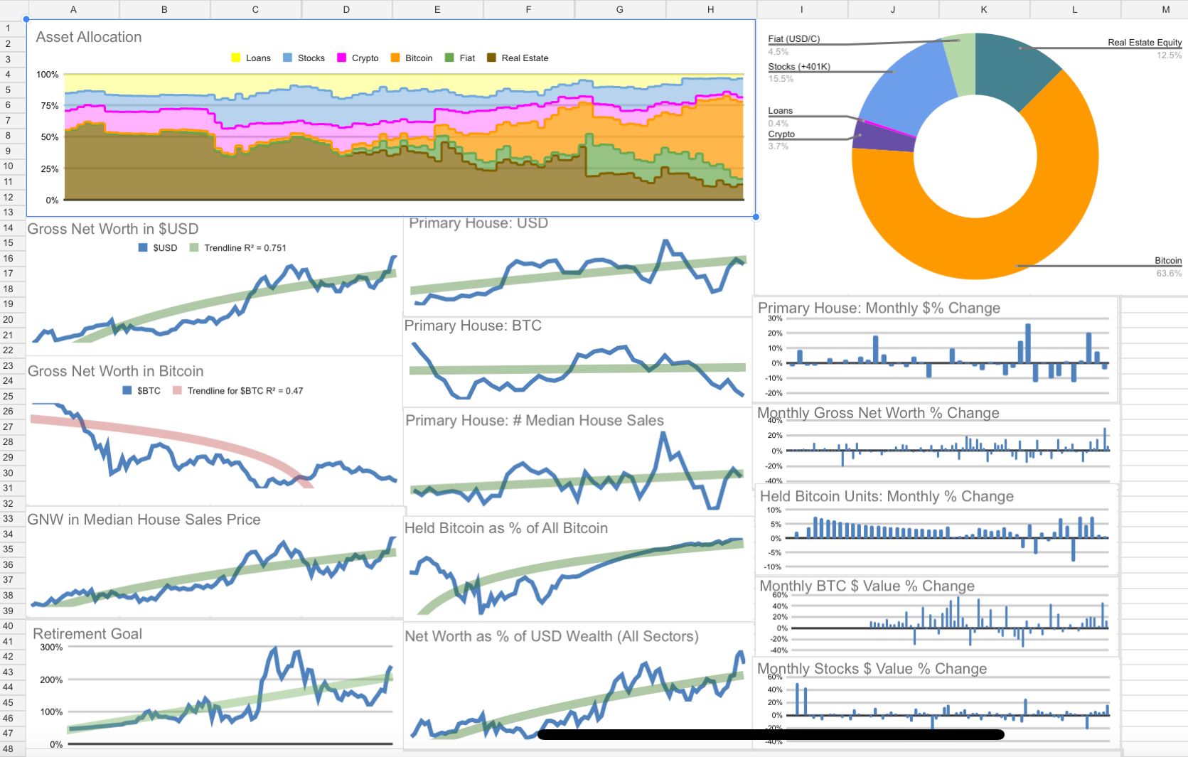 Before Bitcoin was clearly the way, my retirement plan was to maintain crowd lending balances using prosper and lending club—I was making a consistent 12.5% for several years so that seemed like a great plan, until monetary debasement really took off and I found that my house was gaining 15-25% annually and the idea of holding USD debt certificates rubbed me the wrong way. You can see the distribution of assets changing over time in the top left chart (I used to bucket Bitcoin in a single crypto category and it took a while to separate it out as its own thing so most of the early “crypto” bucket was really Bitcoin, but I used to have far too much ETH and LTC back when Coinbase only had those three options).