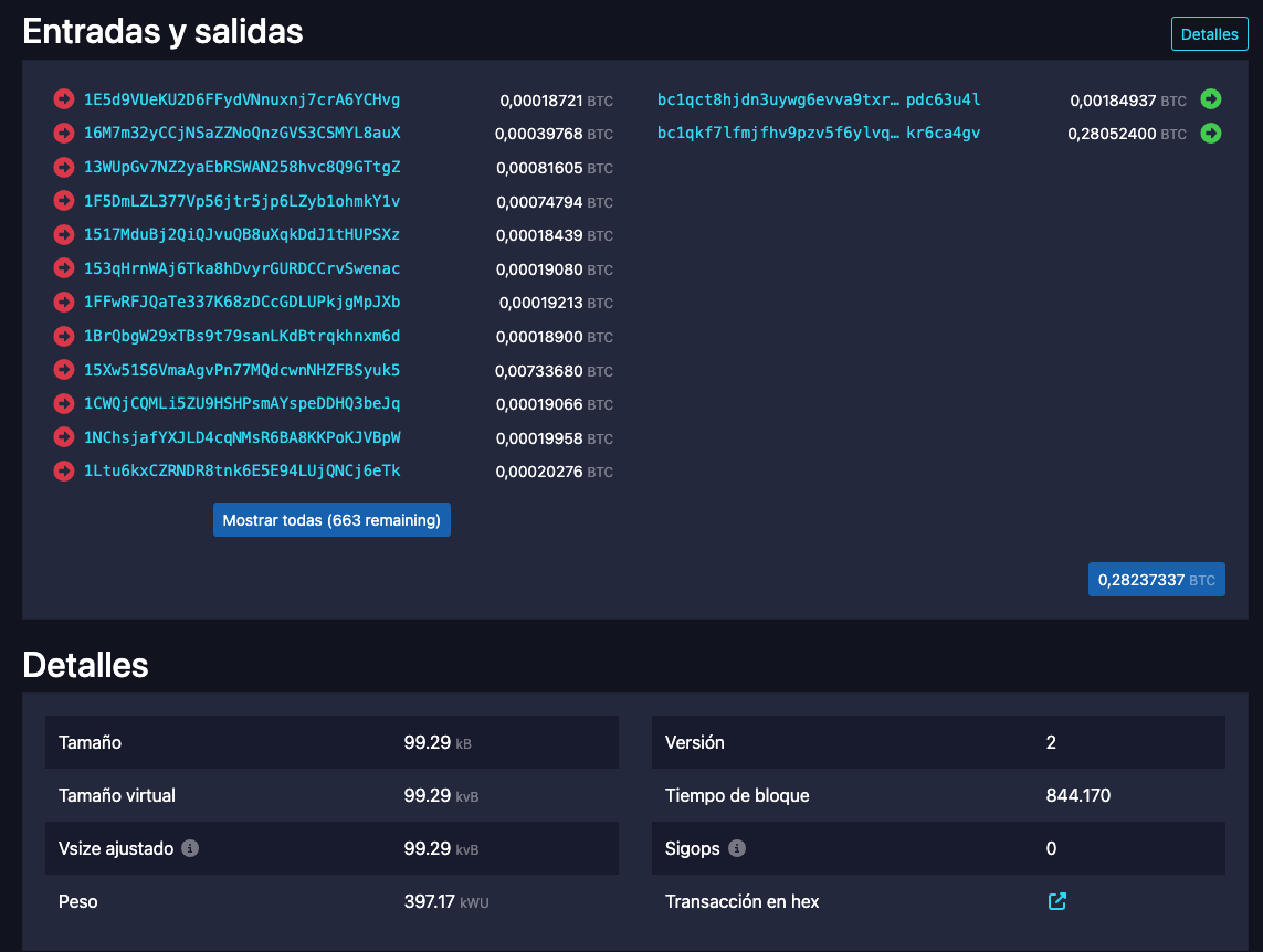 As you can see, this is a transaction in the mempool. This user has transferred a total of approximately 0.2823 units in two outputs, but they had over 650 outputs, meaning over 650 UTXOs in their wallet without consolidation. The consequence of this is...
