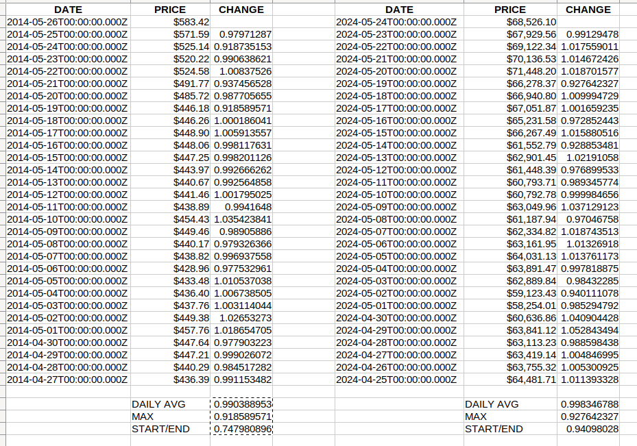 Here is 30 days daily price of Bitcoin 10 years ago and over most recent month.