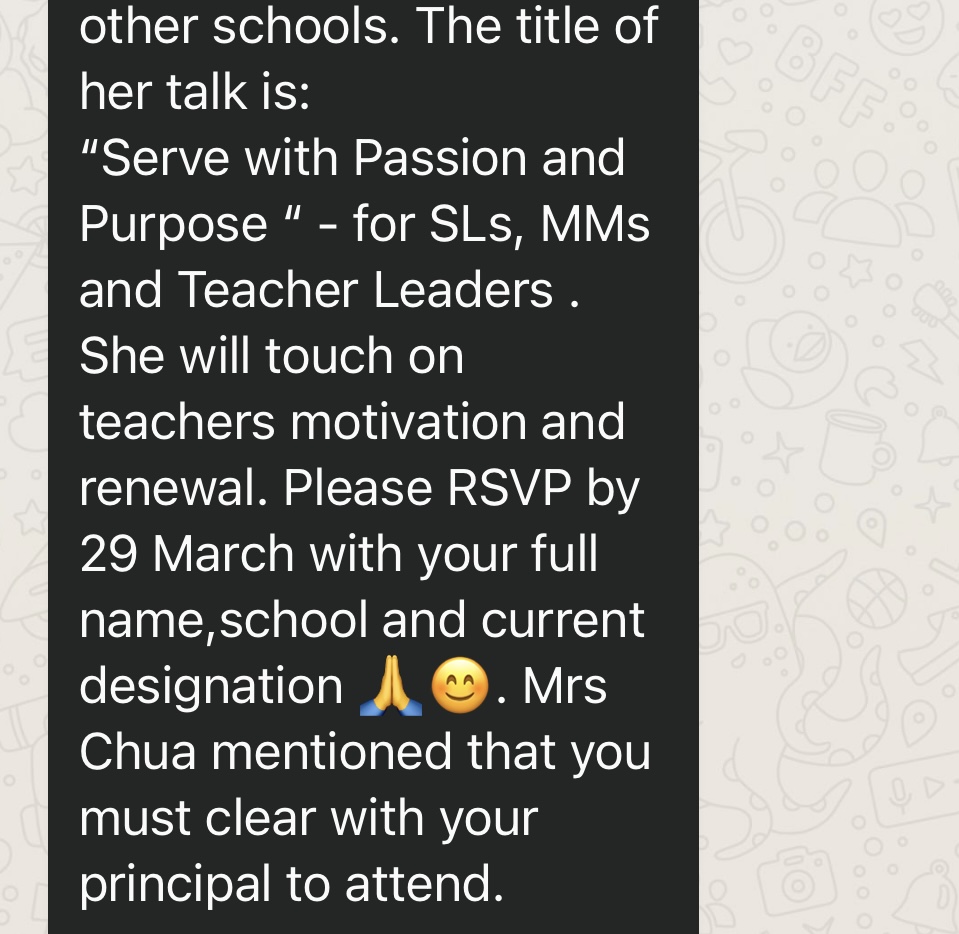 Recently, I attended a talk by the ex-Deputy Director-General of Education. She regaled us with insights and stories in regard to Serving with Passion and Purpose.
