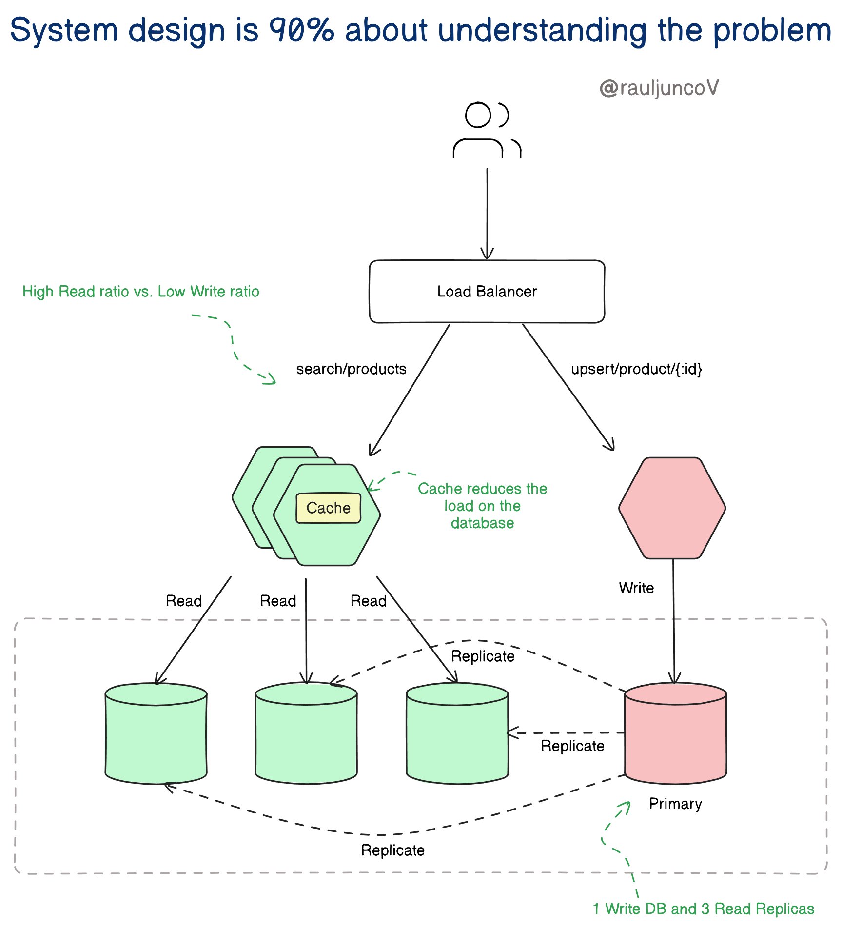 The master handles all write operations, and the replicas handle read operations.