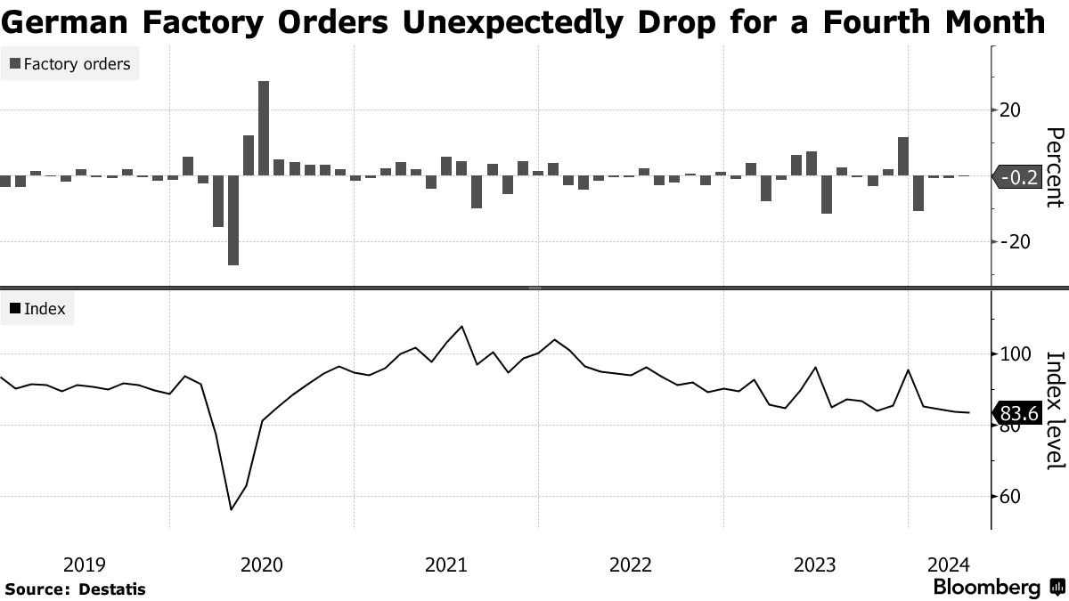 Additionally, the new orders in April fell short due to a lack of large orders. Orders dropped by 0.2% from the previous month and were down 1.6% year-over-year, adjusted for calendar effects. Economists had expected a 0.6% rise. March's decline was also revised from 0.4% to 0.8%.