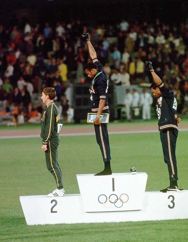 6 - Tommie Smith and John Carlos raised their fists with black gloves on the podium after winning the gold and bronze medals in the 200 meter dash (1968)