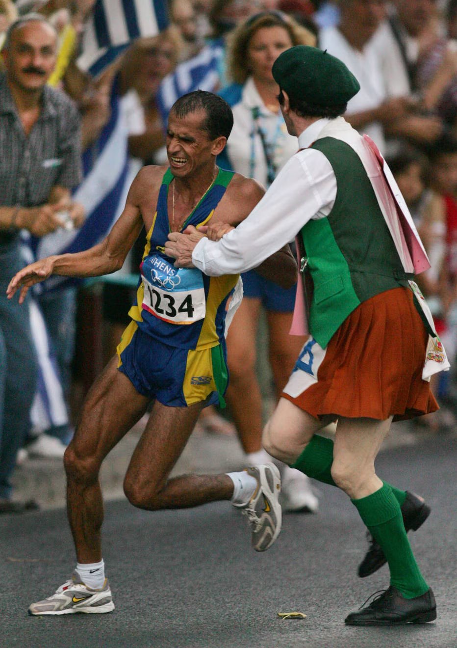 8 – Vanderlei Cordeiro de Lima being hindered by the Irish Priest during the marathon at the Athens Olympics. He was leading the race at that time and finished with bronze (2004)