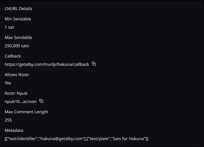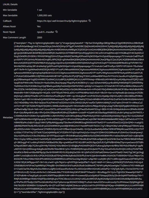 In the LNURL section, there's even more information, including the min & max spendable, a Nostr npub belonging to Alby Zapper, and additional Metadata.
