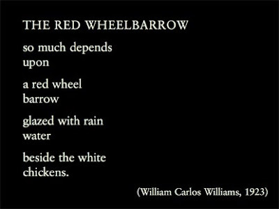 You may have seen this one before. Maybe a bad example, as wheelbarrows and chickens are distant from us in the age of the computer. However, a clever poem such as this is successful at bringing an image to mind and projecting its meaning over it. Do you notice which lines point to the meaning of the wheelbarrow? - a new one