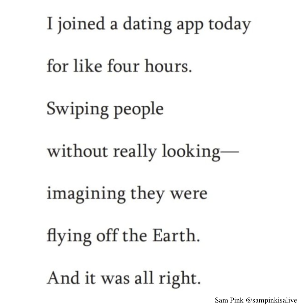 Sam Pink is an artist I've been following since I read his short story "The Ceremony". I think you know exactly what he means in this poem. It's not a head-scratcher, this one. Still, it has solemnity. - from plebpoet