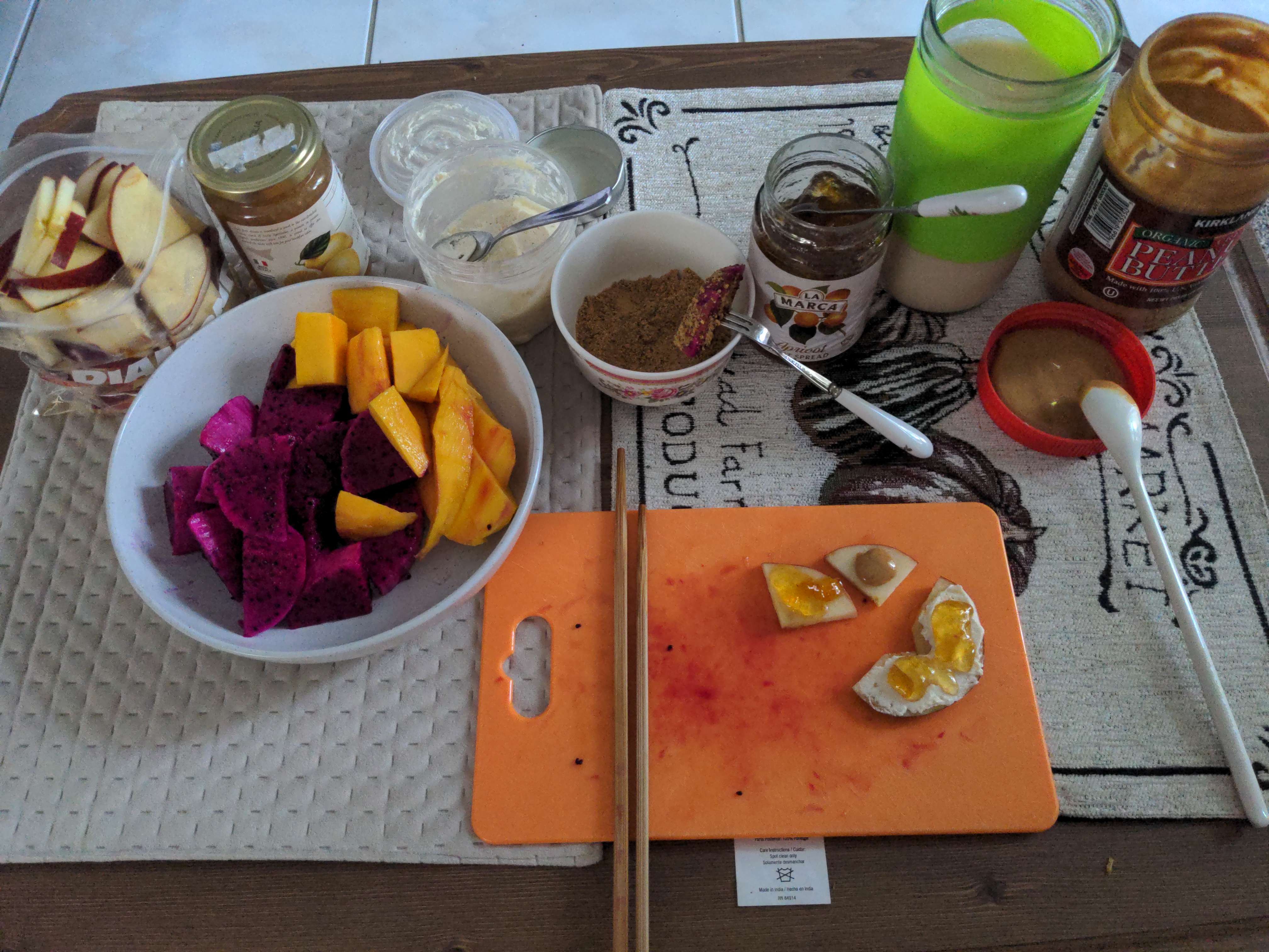 I really enjoy tea as my daily routine, but for today's lunch I decided to have Assam milk tea. Paired interestly well with apricot jam and pb. I tried butter and jam with an apple slice..not quite the donut experience but kinda cheaper/healthier alternative. I used the black sesame soy flour, it was delicious when I dunked dragonfruit and mango.