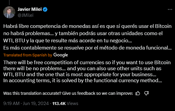 What are your thoughts on Javier Milei's recent commentary regarding the free market of currencies? It seems like Bitcoin, Silver, Gold - whatever people want to use as a currency is allowed without government decree or taxes.