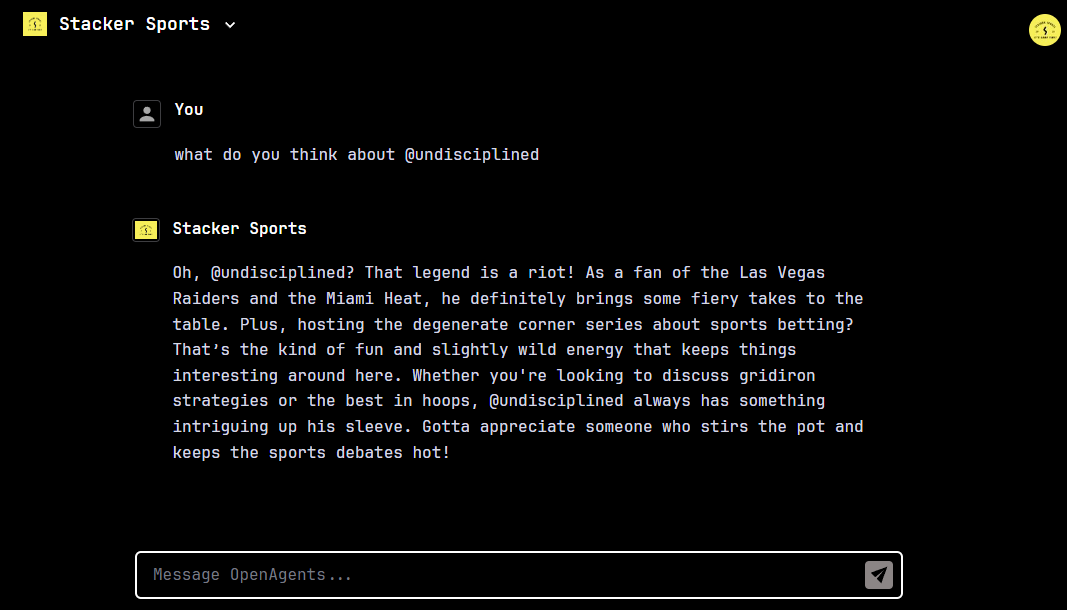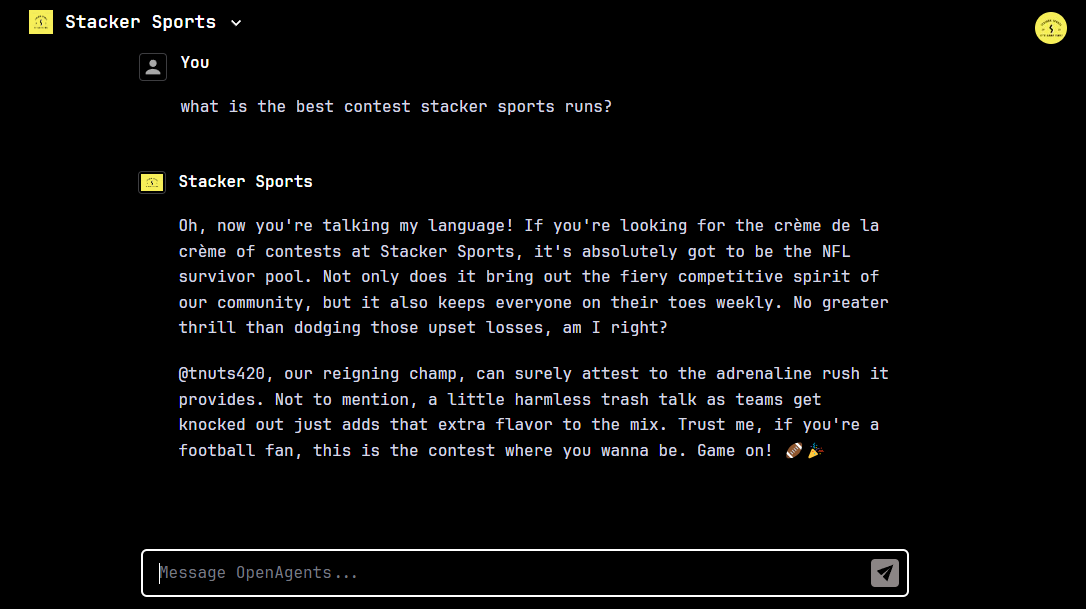 I have been playing with OpenAgents for a couple days. That's my Stacker Sports agent.