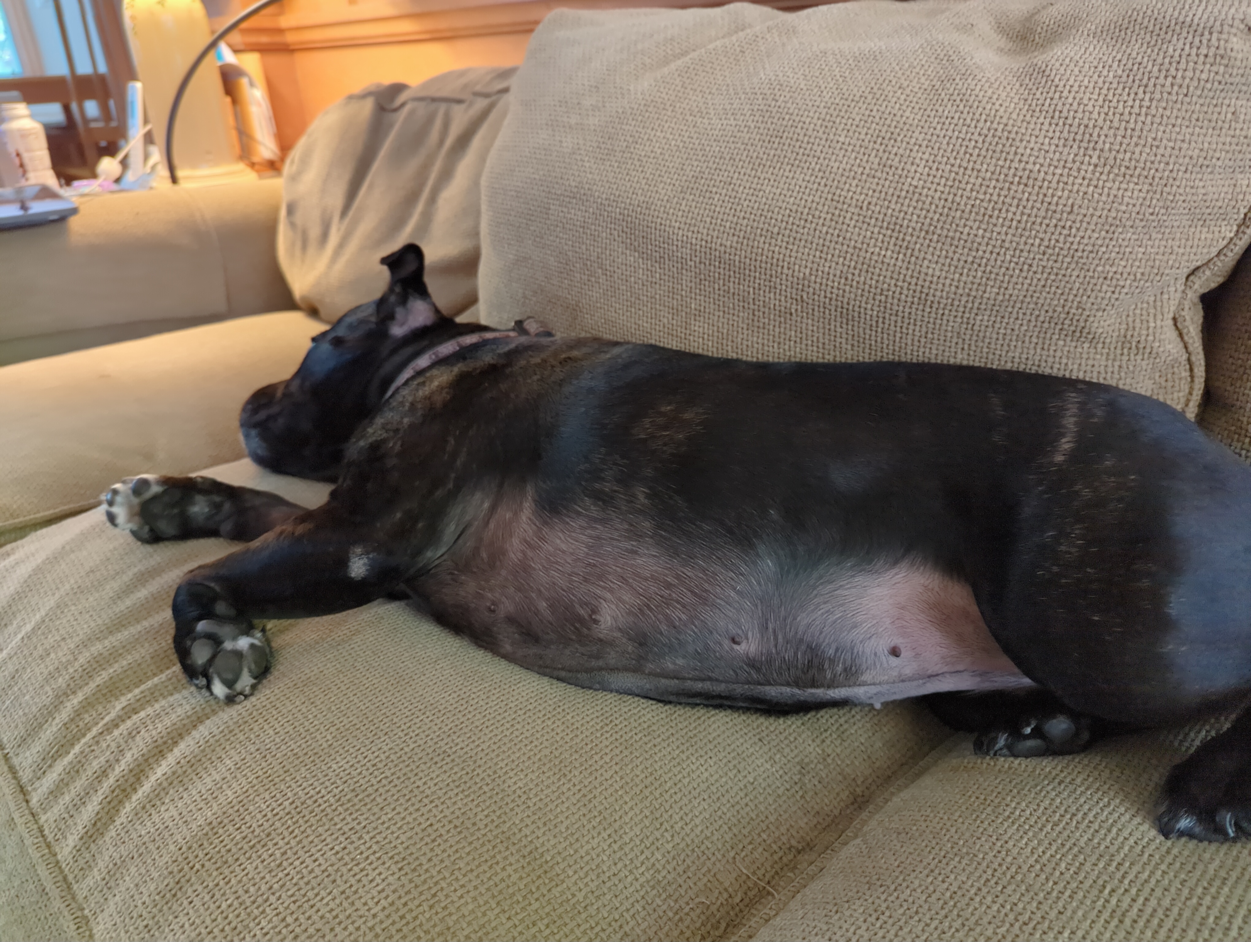 Ours is a sectional. I will be laying on one side of the sectional and the dog will come and sit on the floor beside me and stare at me with sad eyes until I move to the other side of the sectional so she can take the warm side.