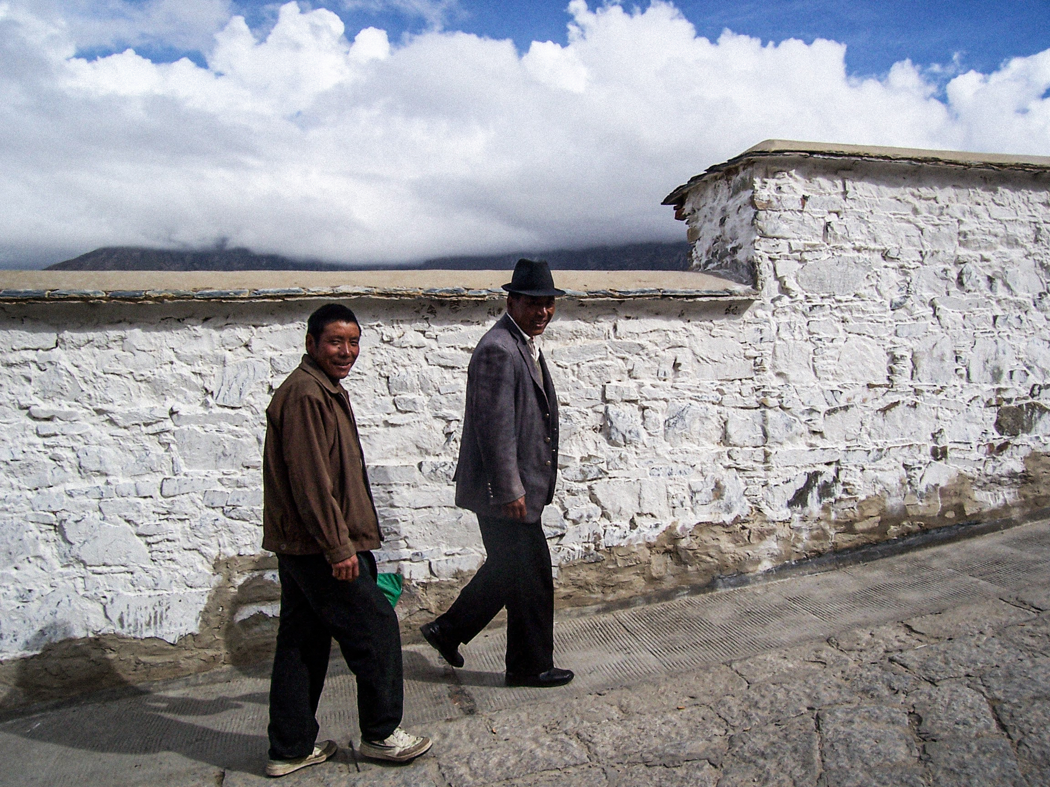 I pass two local men in their temple clothes - a nice jacket and long pants - or if available, a suit jacket, slacks, and bowler or cowboy hat as they look at me curiously.
