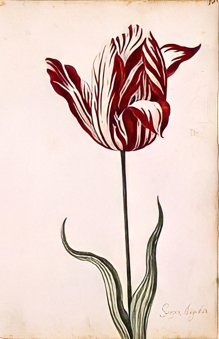 In this picture, we see the most expensive tulip ever sold, named "Semper Augustus," which was sold for 6,000 florins at that time.