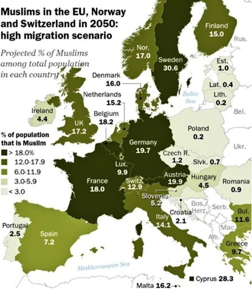 Muslims in the EU, Norway and Switzerland in 2050: high migration scenario