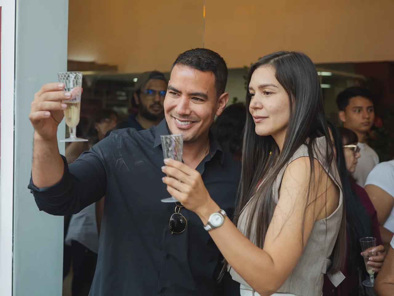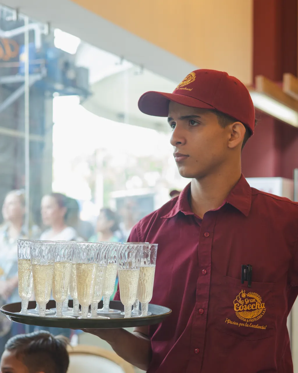 Since I was inside, I could see how one of the workers was waiting to distribute the champagne for the toast: