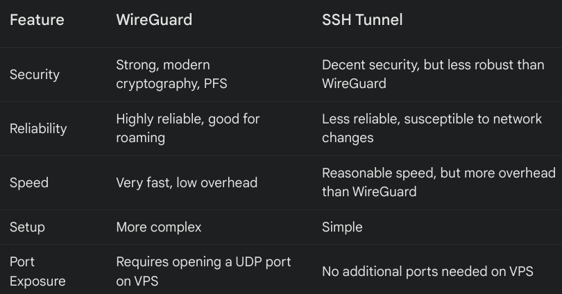 For simplicity and quick setup: SSH tunneling can be a decent option, especially for temporary or less sensitive use cases.
