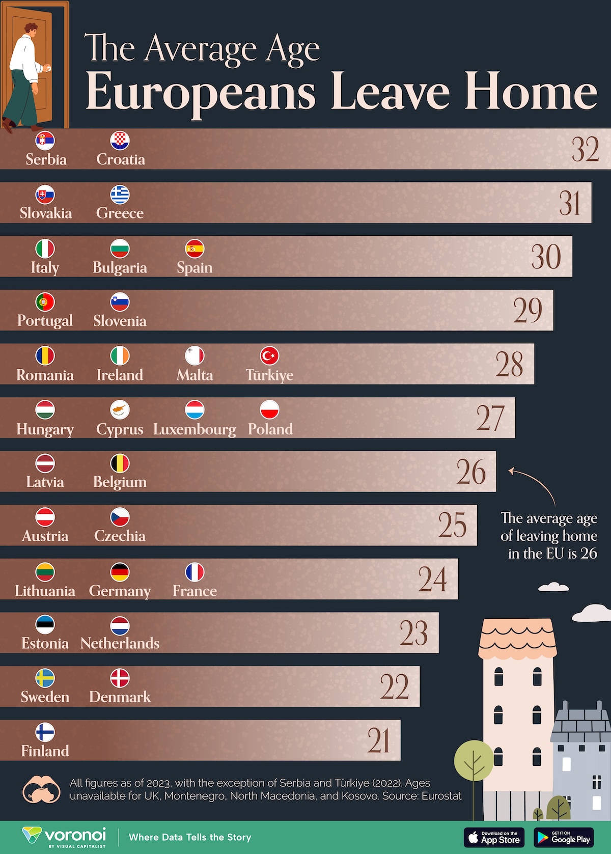 We rank the European countries by the average age at which people leave their parental homes, as sourced from Eurostat data, current up to 2023.