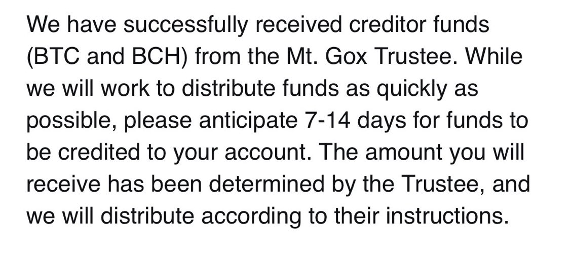 Bitcoin has been received from the Mt. Gox trustee and will be distributed within 7 to 14 days.