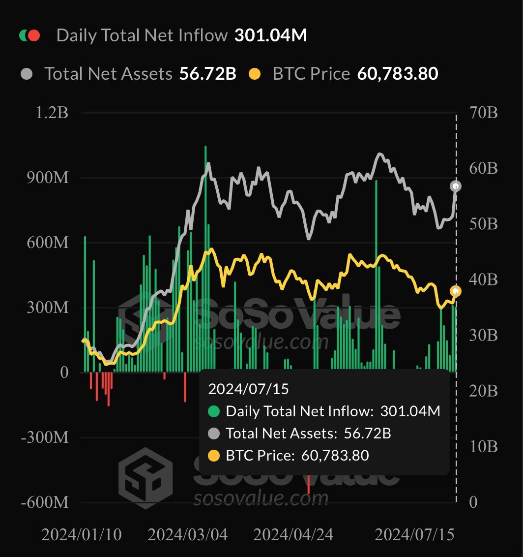 Mutual funds investing in Bitcoin in the US saw inflows of $301 million yesterday, marking the seventh consecutive day of such investments.
