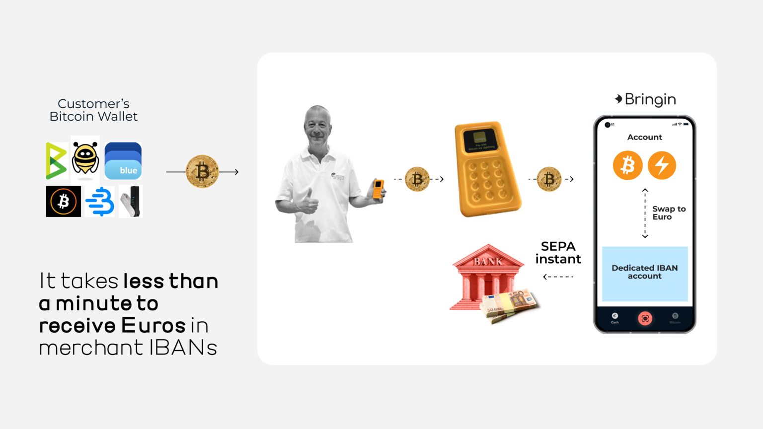 We are excited about our new partnership with Bringin, which allows merchants to receive their incoming Bitcoin Lightning payments in euros in their SEPA account within seconds if needed. This will help onboard new merchants who are generally open to accepting Bitcoin but have concerns about high currency fluctuations.