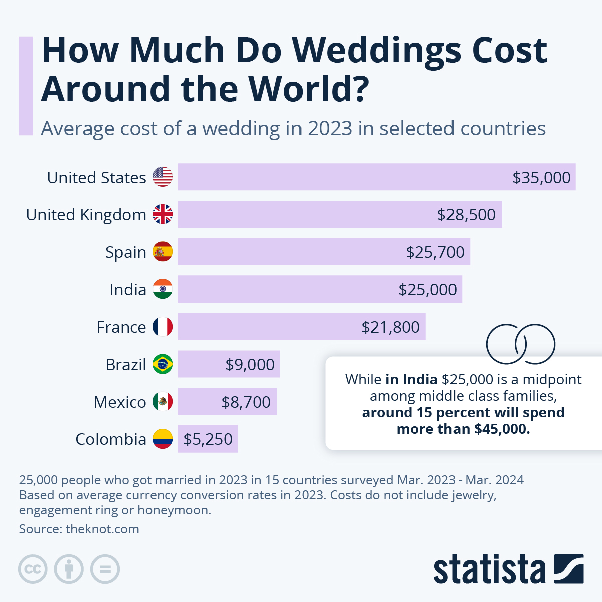 Recently @Coinsreporter wrote a very interesting article about wedding Market in India. I was much intrigues and looked for some data. What I came to know is a few ultra expensive weddings by Indian Royals and Billionaires. But the most shocking thing is that average middle class is now spending more than $20000 in weddings. Let's have a look.