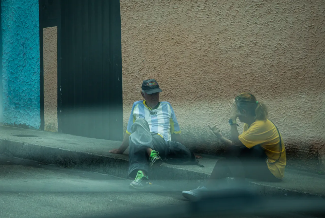 Two people sitting relaxed on the sidewalk, conversing as if they were at home: