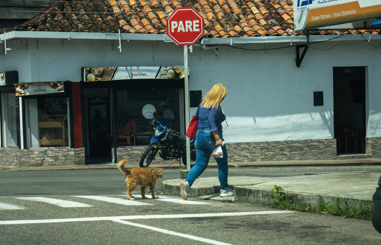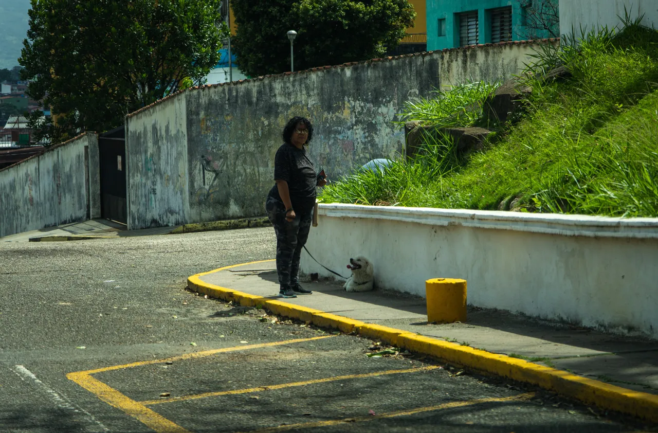 Another woman walking her dog in the middle of the city: