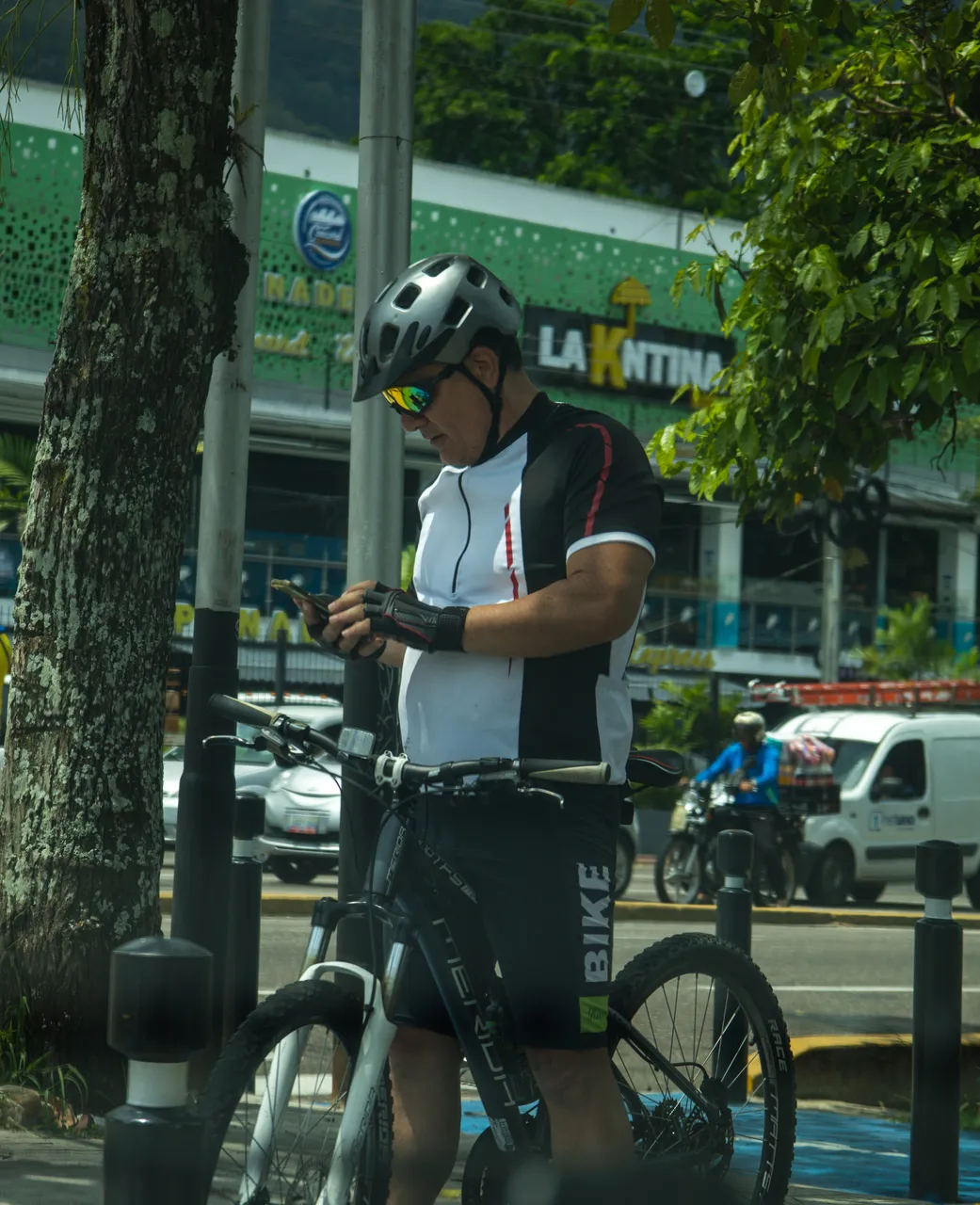 Cyclist in the middle of the city, he was at the traffic light waiting for his turn to go: