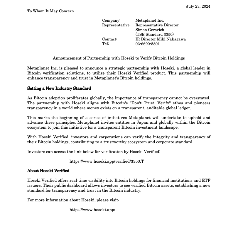 .@Metaplanet_JP has partnered with @hosekiapp to verify it’s corporate $BTC holdings.
