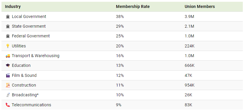 This chart shows the rate of union membership of those employed per industry in America. Data for this graphic is sourced from the Bureau of Labor Statistics (BLS) for 2023.