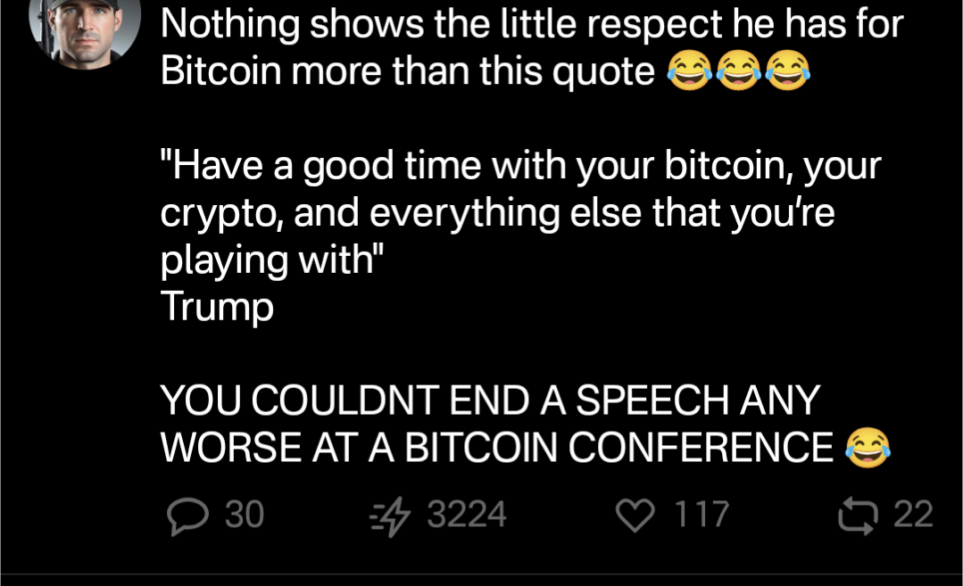 The speech had so much potential that was not used at all just by mentioning "crypto" everytime he had said "bitcoin". Second, he talked about inflation infront of the audiance that understands the topic the most. What the fuck was he talking about when mentioning bitcoin price go up during his presidency ? He took the price go up 3000% as his doing, like what ?