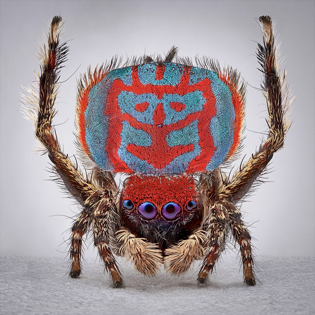 Maratus are commonly referred to as “peacock spiders” due to the males’ brilliant displays during courtship rituals—and in some cases, combat. When a male woos a partner, he raises his legs, displays a brightly patterned abdomen, and dances as if there’s no tomorrow—literally. If he isn’t successful and allowed to mate, the female may eat him instead.