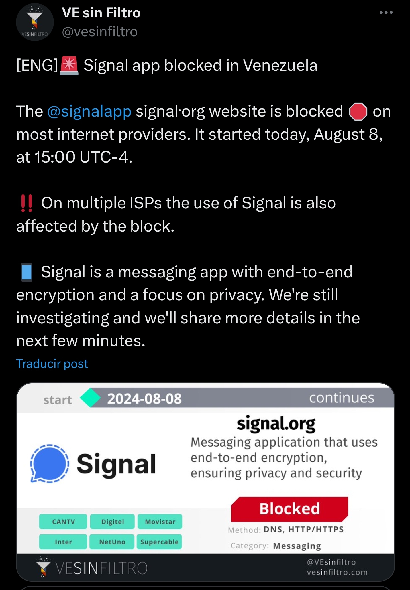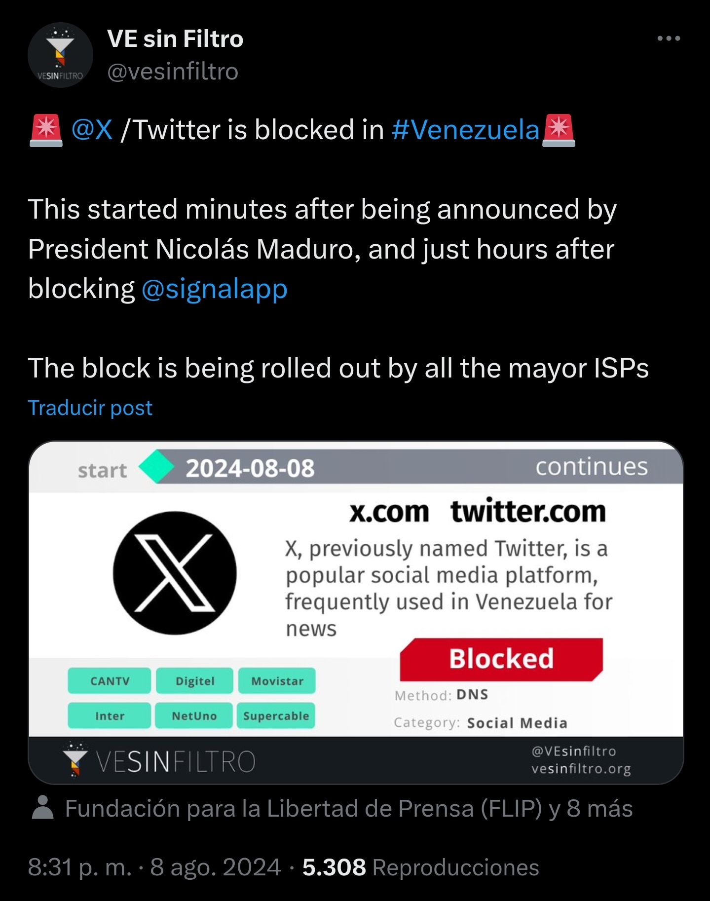 CANTV, the state telecommunications company and the country's main ISP, began blocking @Reddit at 10:30pm on #8Aug (UTC-4)