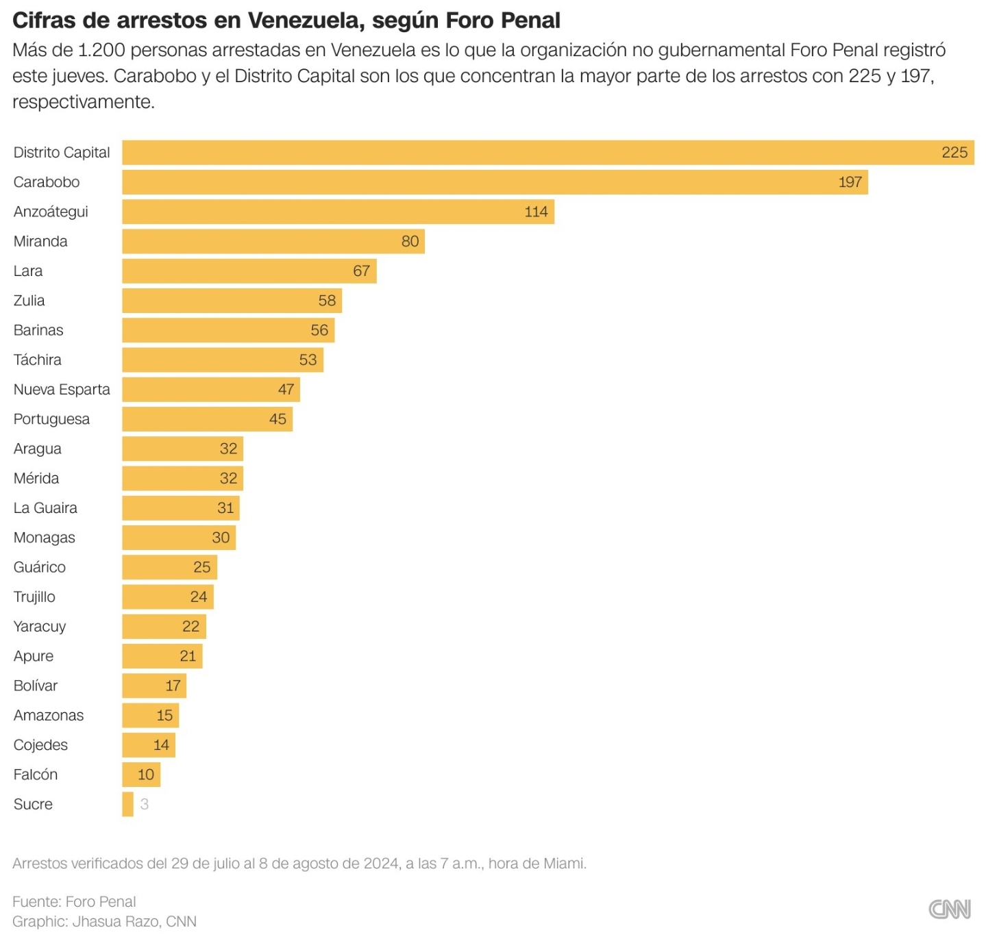 The number of people arrested in Venezuela that the non-governmental organization Foro Penal has recorded until this Thursday is 1,229, including at least 105 minors, 16 who have a disability and five indigenous people.