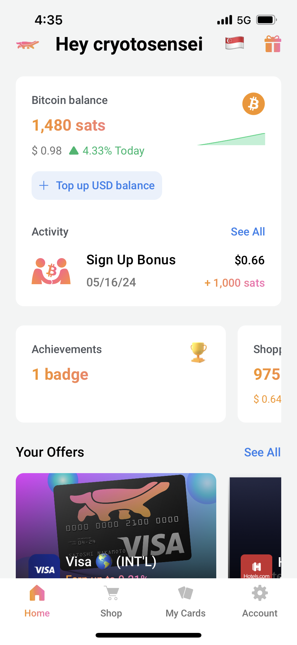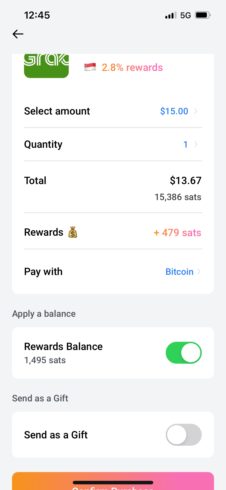 The Bitcoin Company offers pretty decent cashback in the form of sats. Since it provides 2.8% rewards for my chosen brand, Grab, this means that I got to save 479 sats the next time I bought a Grab voucher.